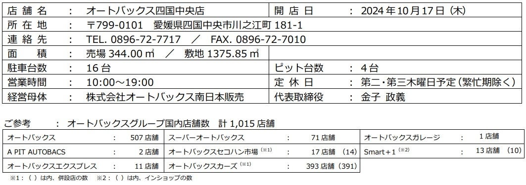 株式会社オートバックスセブン(代表取締役 社長:堀井勇吾)と加盟店契約を結んでいる株式会社オートバックス南日本販売(代表取締役:金子政義)は、2024年10月17日(木)に「オートバックス四国中央店」を新規オープンいたします。