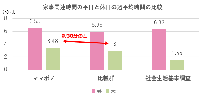 ママボノ経験者の夫の家事関連時間は1日平均3.48時間で、比較群(3.0時間)より約30分長く、社会生活基本調査の一般的な共働き世帯の夫(1.9時間)と比べても大きな差があります。