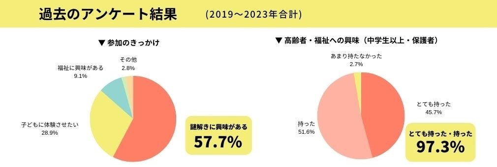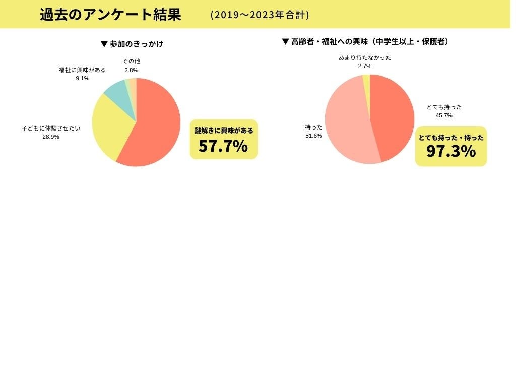 「参加のきっかけ」では、ただ「謎解きに興味がある」という理由から来場した参加者が約60%と、ターゲットである今まで福祉に興味・関心のなかった層に多くご参加いただくことができました。