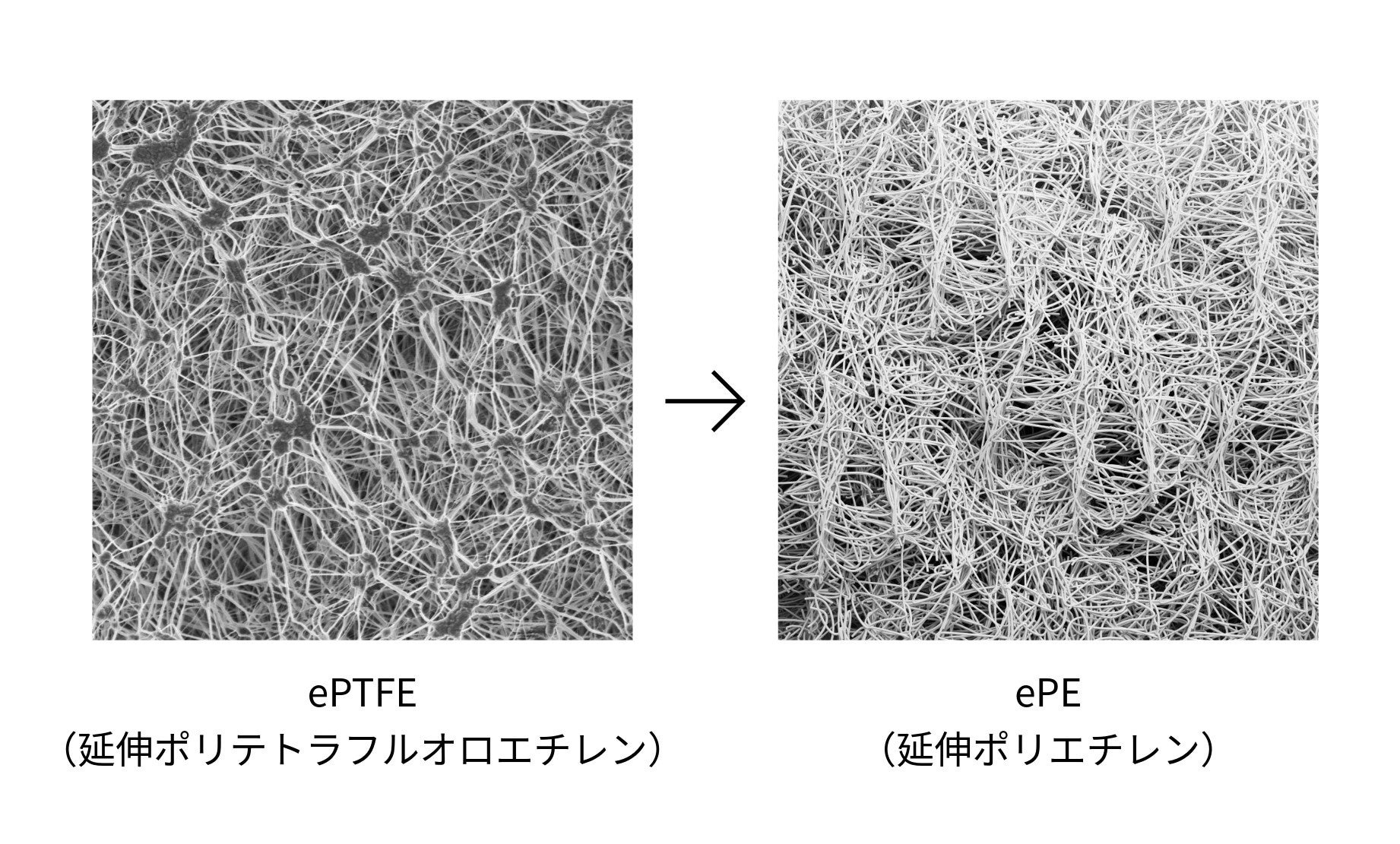 GORE-TEX プロダクトの機能の要となる GORE-TEX メンブレン(膜)の素材が、フッ素ポリマーを加工したePTFE(延伸ポリテトラフルオロエチレン)から、ePE(延伸ポリエチレン)に進化しました。