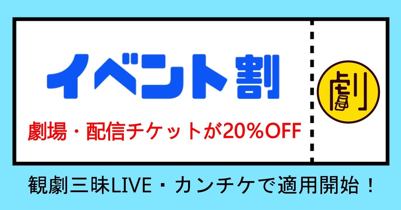 ライブ配信サービス「観劇三昧LIVE」、電子チケットサービス「カンチケ」で取り扱いの対象公演にもイベント割が適用されているため、より気軽に演劇をお楽しみいただける機会となっています。