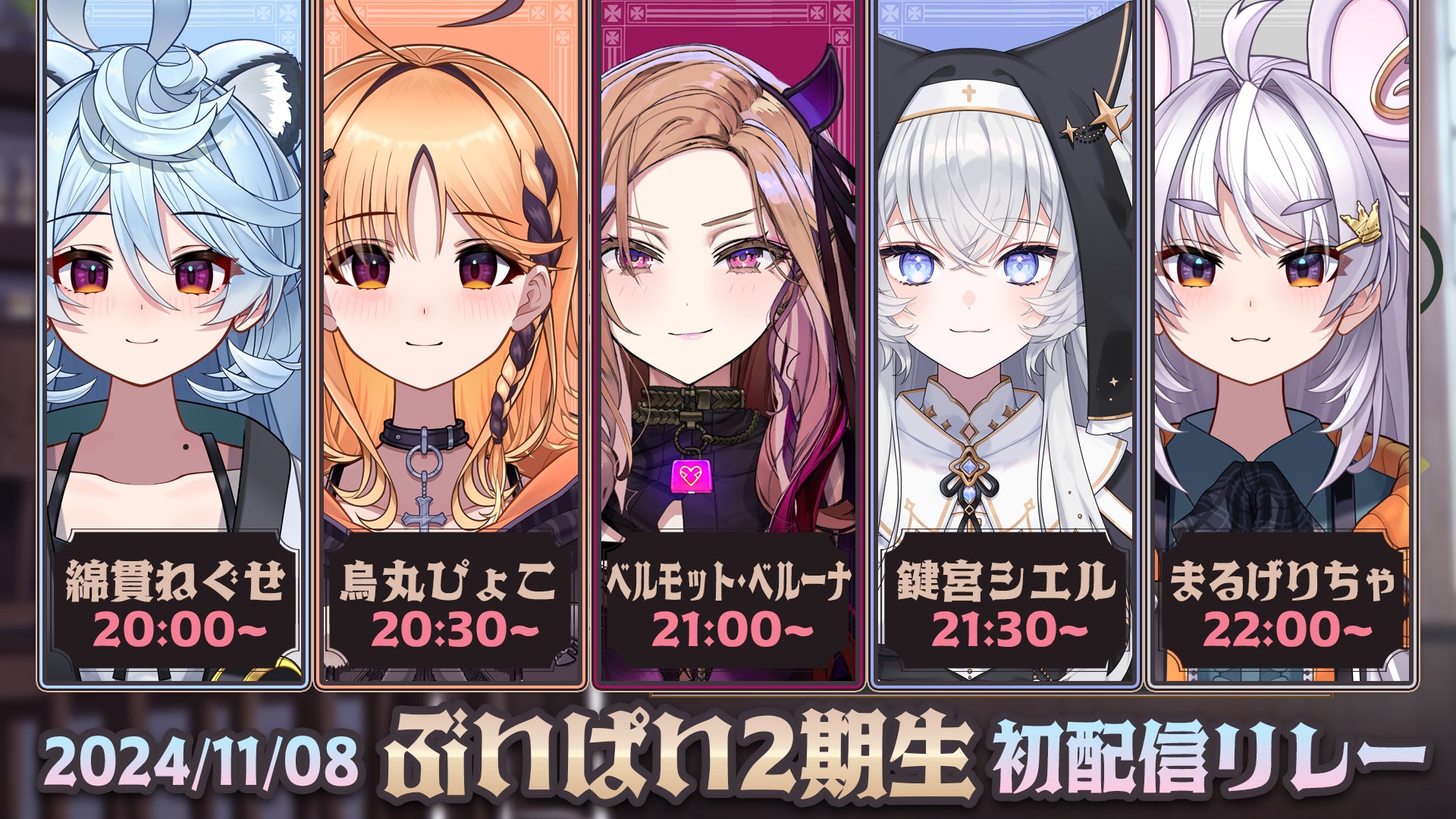株式会社アップランド(本社:東京都渋谷区 代表取締役:宗像 秀明、以下「当社」)は、本日2024年11月8日(金)より当社VTuberグループ「ぶいぱい」から2期生の追加メンバー5名がデビューすることをお知らせします。今後もX(旧Twitter)やYouTube等の配信プラットフォームを中心に、精力的に活動を行ってまいります。Youtubeでの初回配信は各VTuberのチャンネルにて、本日20:00よりリレー形式で行います。
