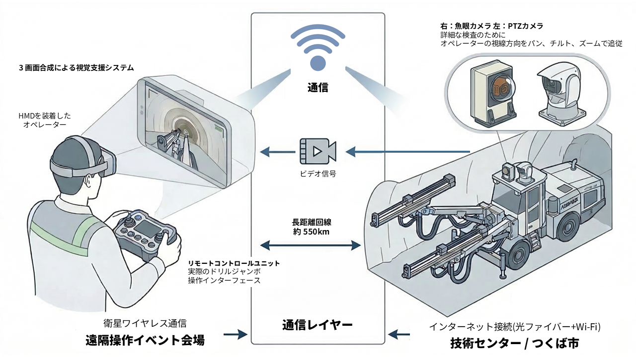 本システムは、山岳トンネル施工現場における省人化・安全性向上を目的として開発されました。今回の実証では、専用線ではない一般的なネットワーク回線を用い、通信環境の制約がある条件下での遠隔操作の有効性を検証しました。