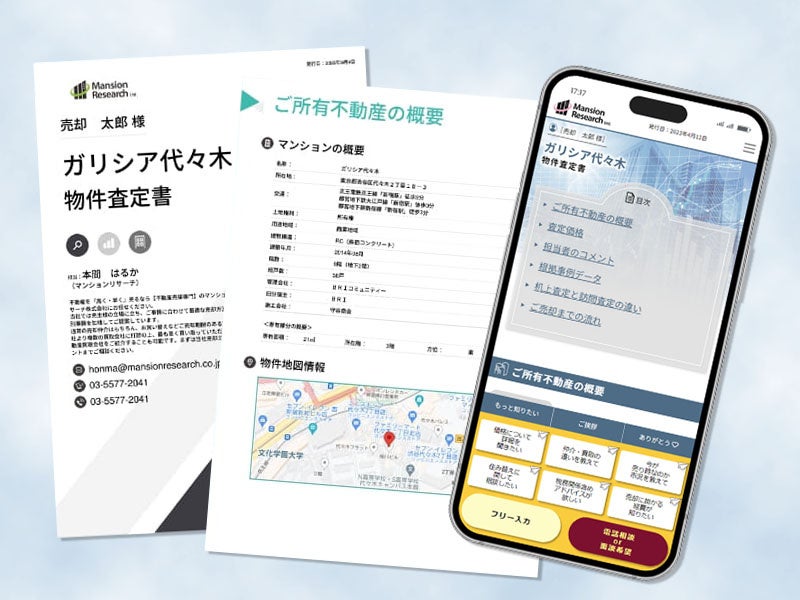 サービス内容:不産売却を検討される方に向けた査定書作成サービスです。業界トップクラスの美しいデザインの査定書を、最短1分で作成可能。PDF挿入機能により、自由度が高い査定書作成が可能な点も特徴です。