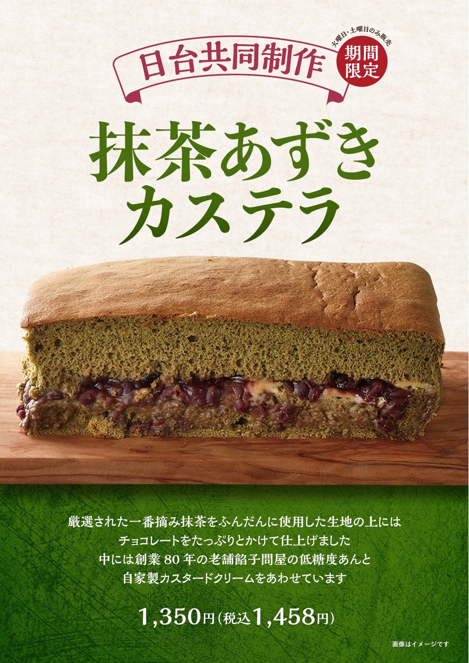 厳選された一番摘み抹茶をふんだんに使用したふわふわしゅわしゅわの台湾カステラの生地に、創業80年の老舗餡子問屋の低糖度あんと自家製カスタードクリームをあわせ上にはチョコレートをたっぷりとかけて仕上げた日本と台湾の共同制作商品です。
