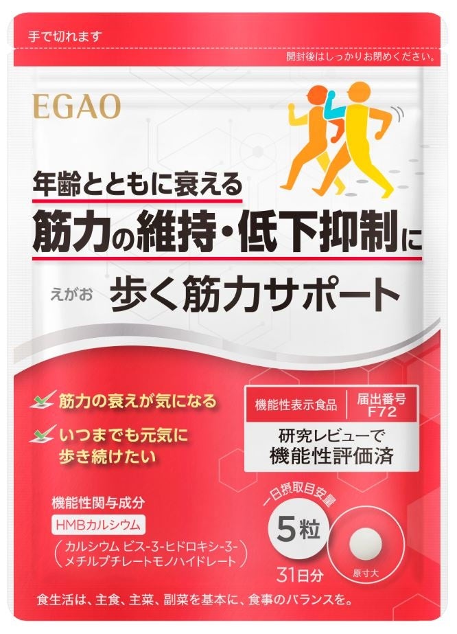 株式会社えがお(代表取締役会長兼社長 北野忠男 / 所在地: 熊本市東区東町4-10-1)は、筋力の衰えが気になる方に向けた機能性表示食品『えがお 歩く筋力サポート』を7月1日より販売開始しました。