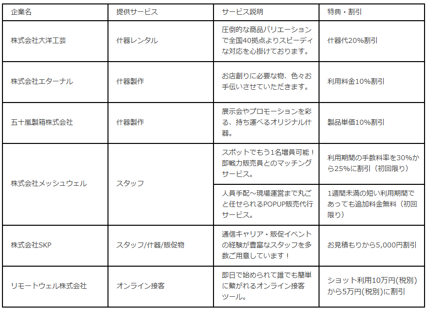 | 株式会社メッシュウェル(POPUP販売代行) | スタッフ | 人員手配~現場運営まで丸ごと任せられるPOPUP販売代行サービス。 | 1週間未満の短い利用期間であっても追加料金無料(初回限り) |