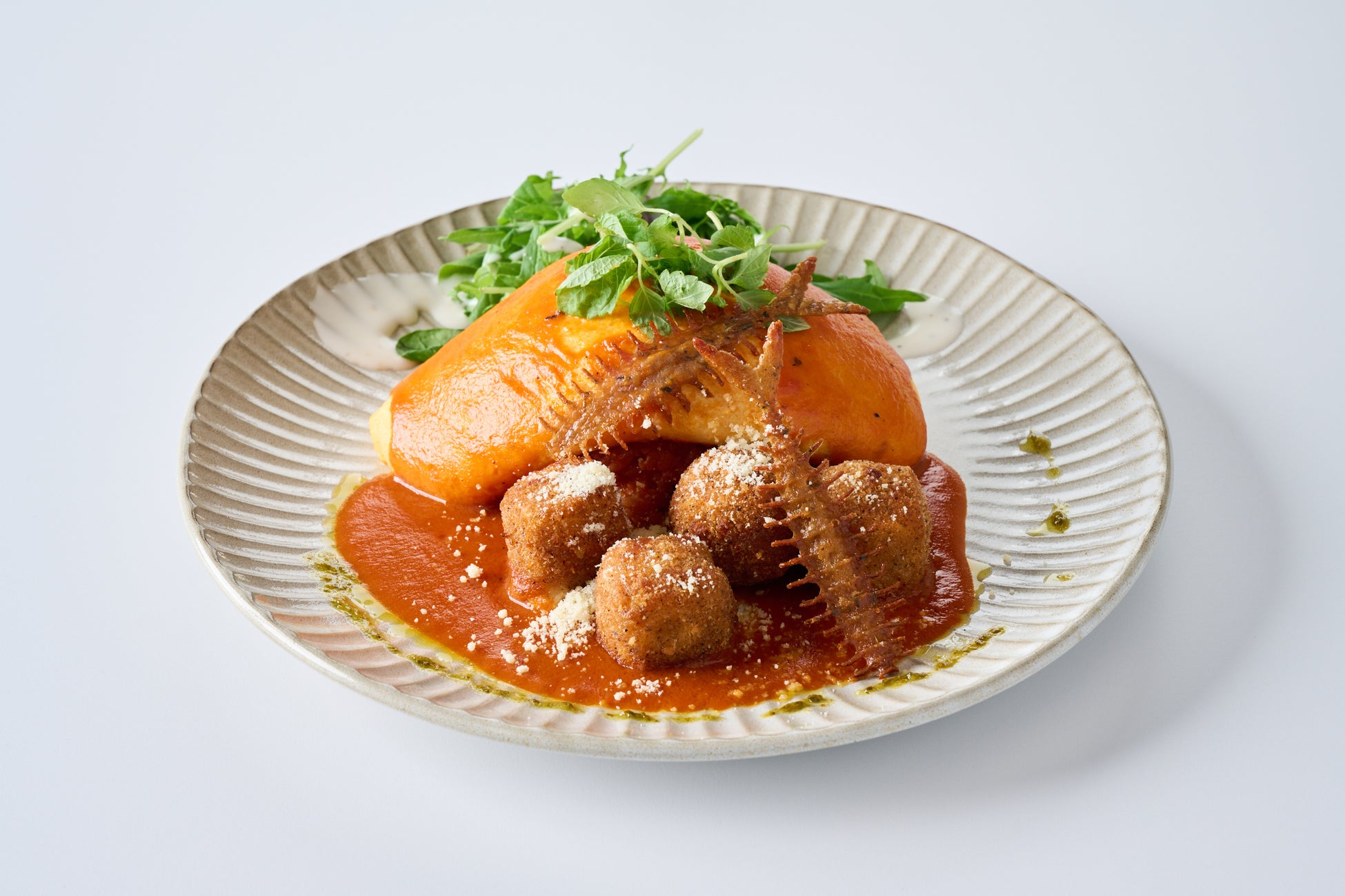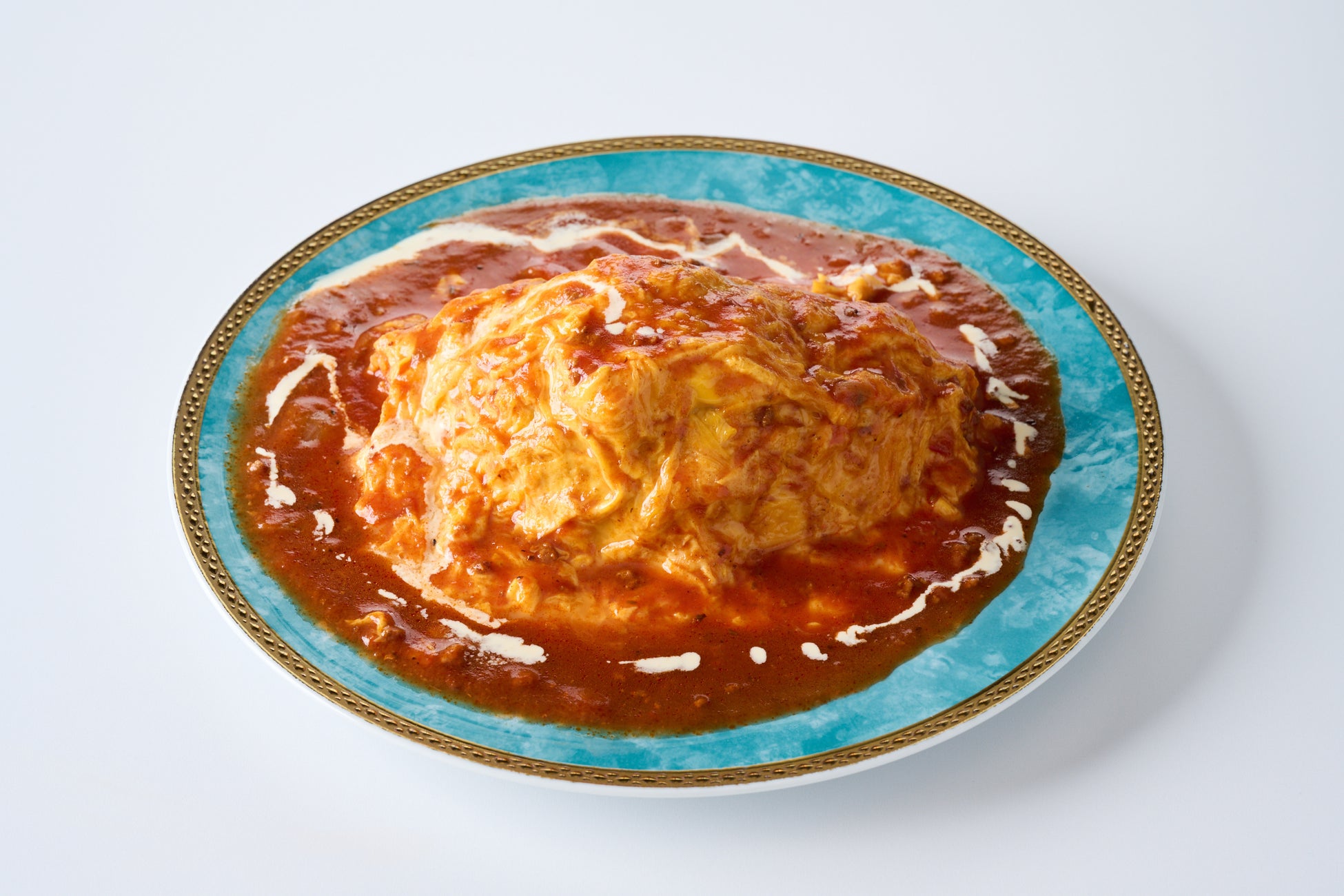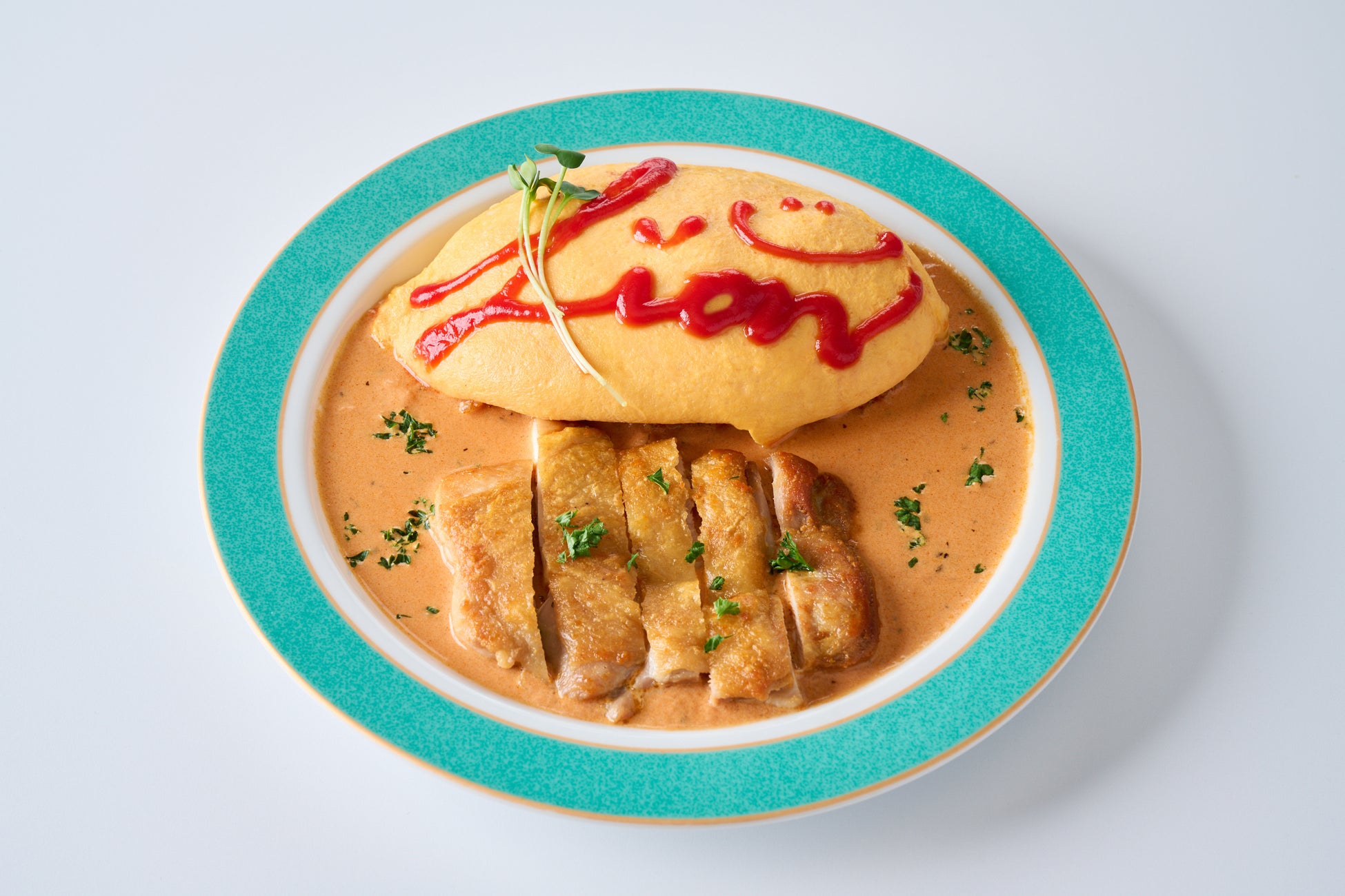 地元栃木県の卵、鶏肉、お米を使用。トマトケチャップの使い方にこだわり、香ばしいチキンライス、チーズ入りのふわとろのオムレツ、まろやかなトマトクリーム、パリッと焼き上げたチキンで華やかな一皿に仕上げたオムライス。