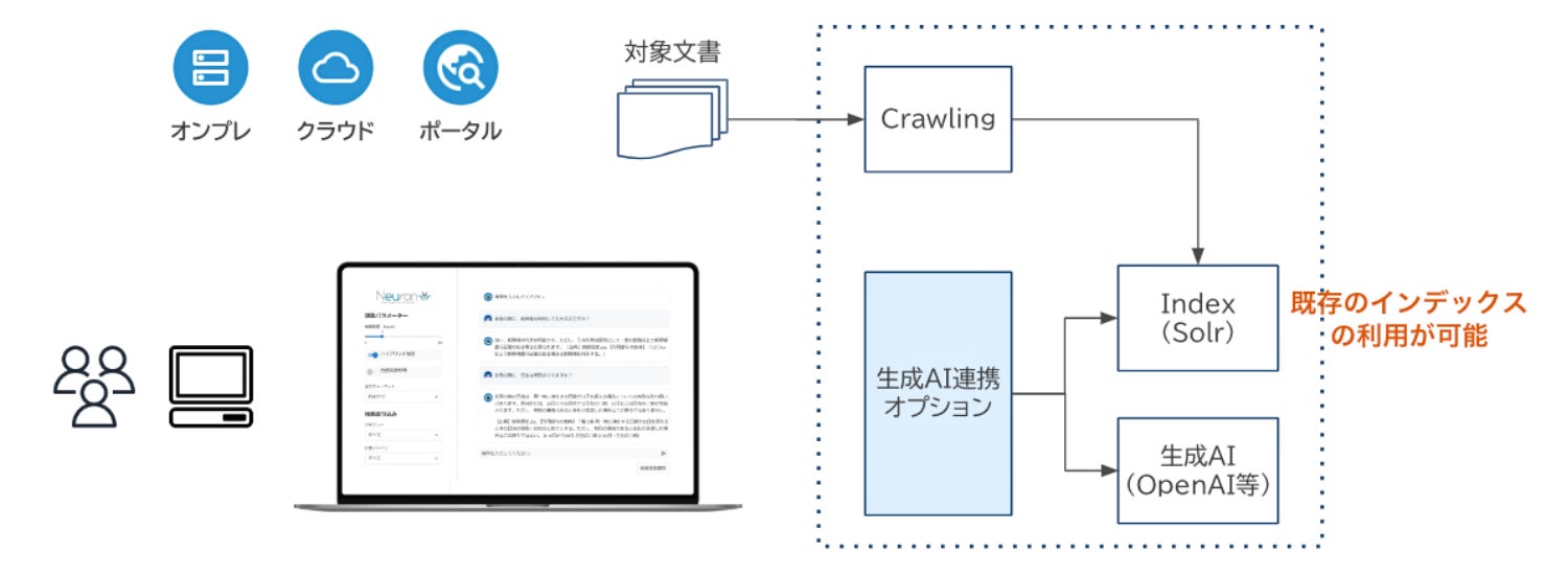 エンタープライズサーチ「Neuron ES」を導入されているお客様については、既に保有する環境(インデックス情報)を利用したクイックな機能提供が可能です。(オプション費用は別途お問い合わせ)