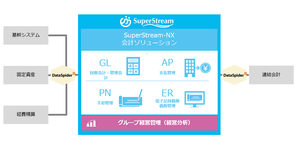 仕訳情報はSuperStream-NXへの直接入力だけでなく、各カンパニーで発生する大量データに関しては、(株)セゾン情報システムズが提供する「DataSpider Servista」を活用し、夜間バッチで連携する運用となっている。さらに、必要な帳票は自動的にPDF化するような仕組みも構築。