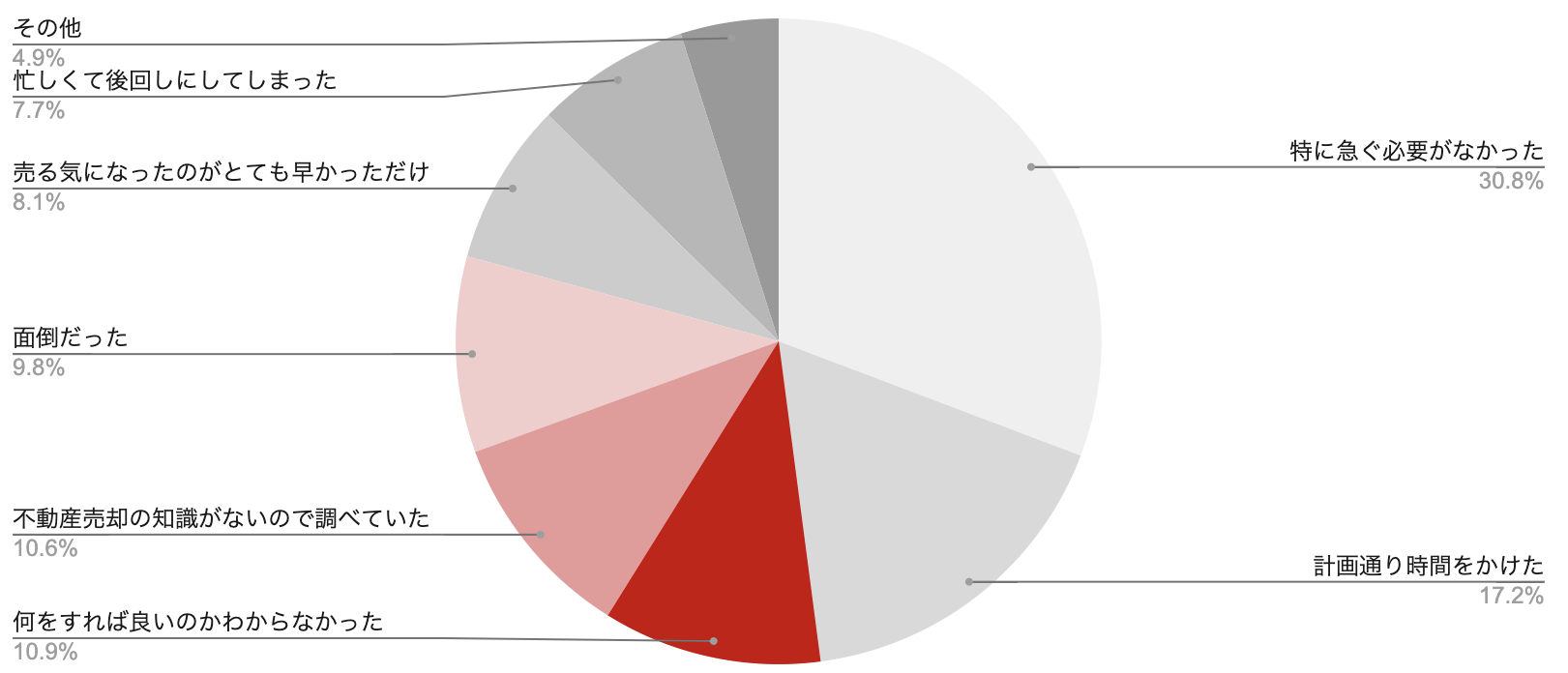 次に、『行動に移さなかった理由はなんですか?』と聞いたところ、「特に急ぐ必要がなかった(売らなくてはいけない期限がない等)」が最も多く、全体の30.8%でした。続いて「計画通り時間をかけた」(17.2%)、「何をすれば良いのかわからなかった」(10.9%)、「不動産売却の知識がないので調べていた」(10.6%)という結果になりました。
