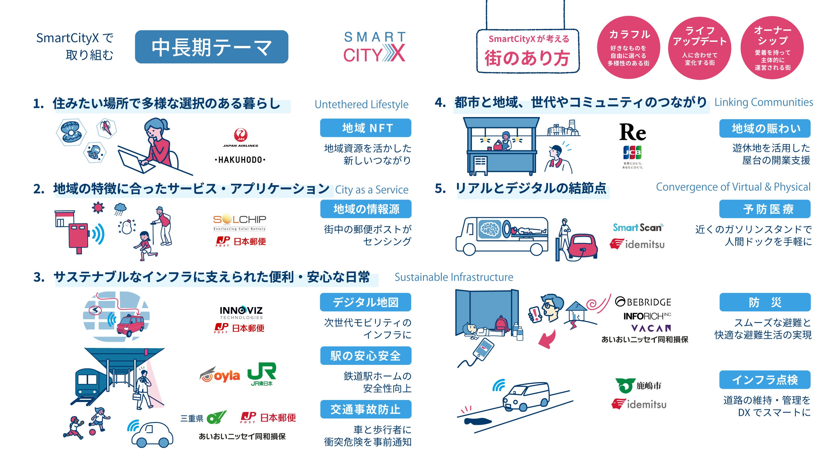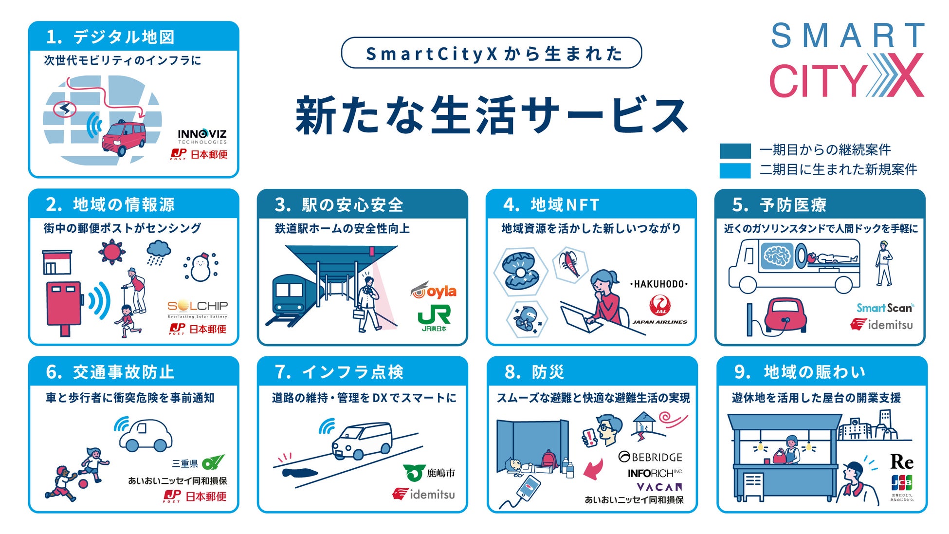 『SmartCityX』では、上記の事業共創プロジェクトをはじめ、日本が世界に先行して直面する高齢化や昨今頻発する自然災害等の社会課題、及び、地域の観光資源など注目が集まる領域において、デジタルやモビリティ、防災、インフラ、観光等の各分野で企業・組織の枠を超えた協業が生まれています。