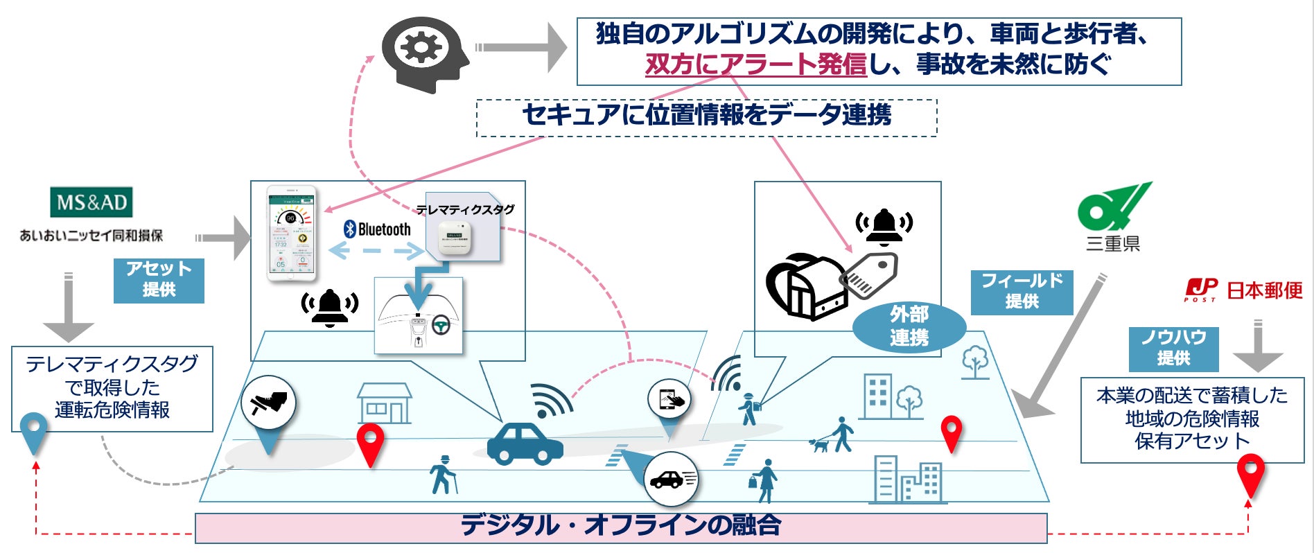 ● 概要:IoTデバイスで車両と歩行者の位置情報を把握し、事故の危険を感知・車両と歩行者双方に危険アラートを通知することで、自動車事故を未然に防ぐスキームを構築します。自動車の位置情報はあいおいニッセイ同和損害保険の有するテレマティクスタグから取得し、歩行者側の位置情報はスマートフォンや見守りタグなどのIoT機器から取得します。本仕組みの実現に向けて、日本郵便が保有する事故防止ノウハウや郵便局の配達員の知見を活用しながら、児童の交通事故防止を目的に、三重県内での実証実験を計画していきます。将来的には本仕組みを活用し、身の回りのあらゆるリスク(事故、防災、犯罪等)を回避する世界を目指します。