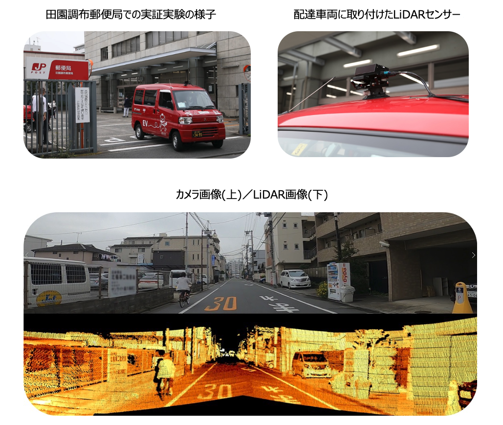● 概要:Innoviz Technologiesが開発する高精度なLiDARセンサーを日本郵便が有する配達車両に搭載することで、配達経路における道路や建物の変化等の情報を高鮮度に取得して、自動運転や無人配送など次世代の住民向けサービスの基盤となるデジタル地図の構築を目指すほか、道路の損傷状況や空き家対策などの地域課題解決に加え、新たなビジネスの創造を目指します。Innoviz Technologiesのセンサーは天候を問わず緻密な3D点群データを生成できる点が特徴で、両社は2022年6月16日に田園調布郵便局にて実証実験を実施するなど、新たなデータの取得・活用の検証を開始しています。