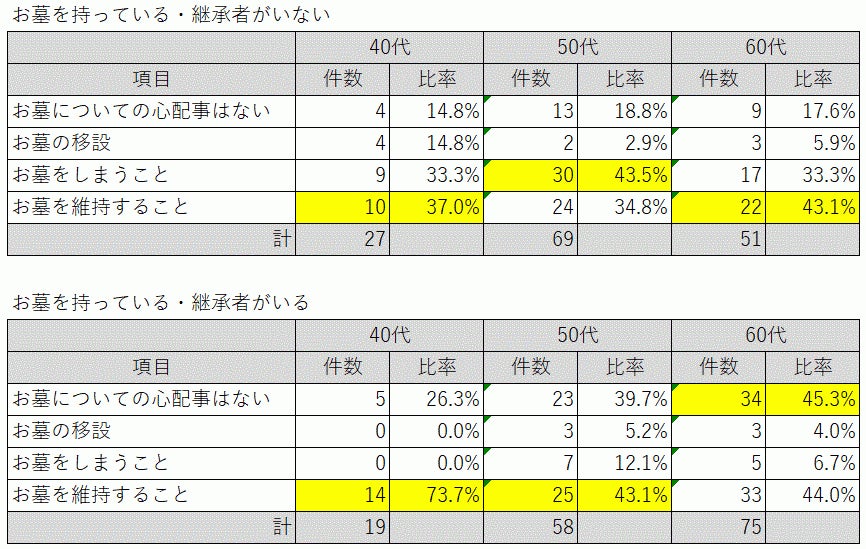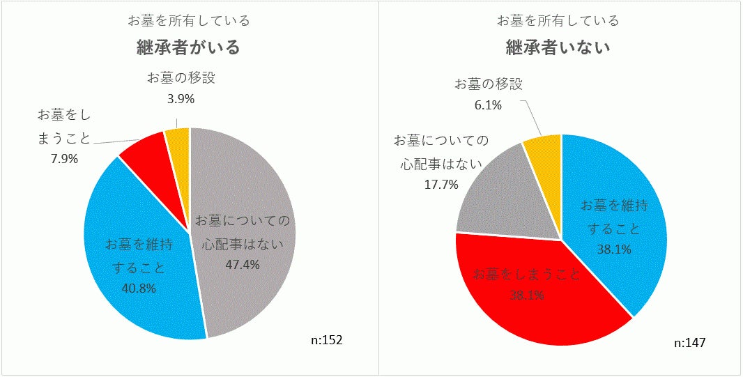今回のアンケートでは、「老後のお墓についての心配事」をテーマに調査を実施。お墓を所有している人については継承者の有無、年代によって、意識が異なることがわかった。特に“継承者がいない”人が、「お墓を維持し続ける」のか「お墓をしまうのか」について悩み事を抱えていることわかり“、現役世代から離れる事を意識する時期なのか継承者がいない”50代が墓じまいを明確に意識し始める事が読みとれるアンケート調査となった。