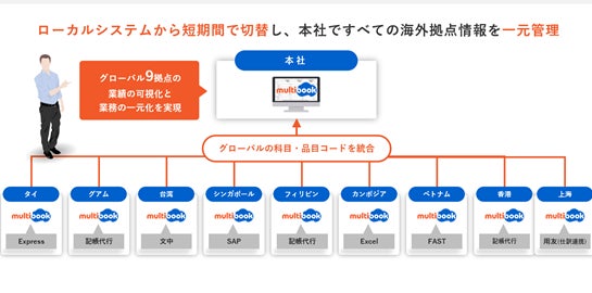 日本本社からは海外現地法人の会計、在庫等経営管理情報を日本語、日本円、本社勘定科目でリアルタイムに確認でき、海外現地法人からの報告業務の効率化、不正対策にも効果を発揮。最短2週間での導入も可能です。