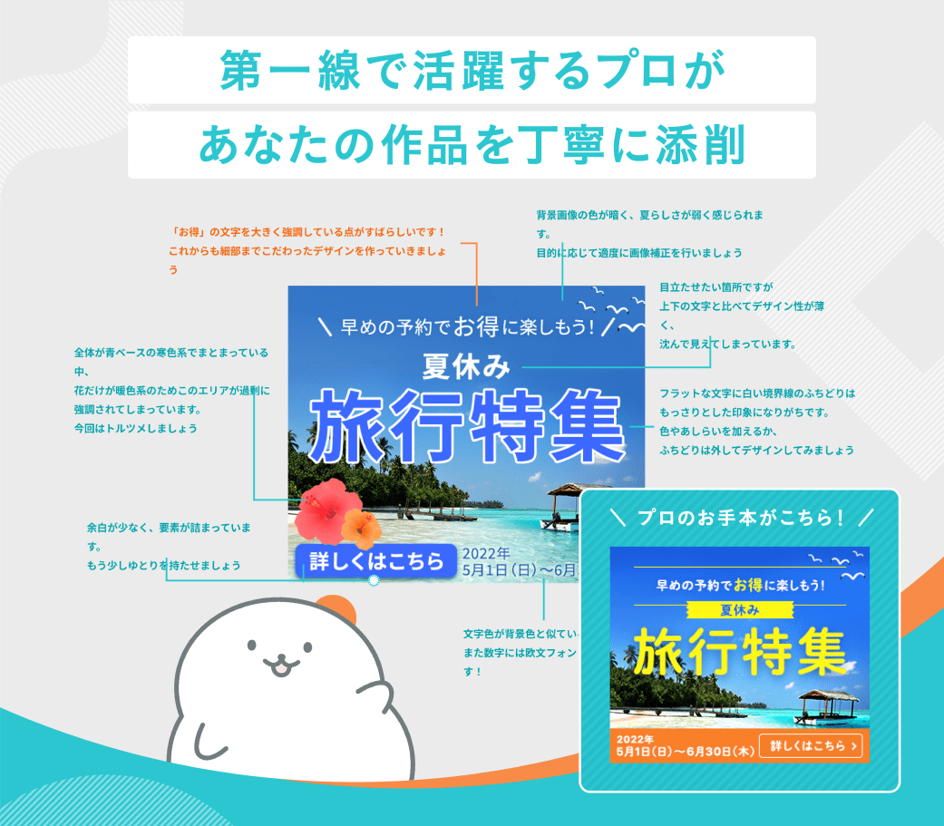 例えば『入門編』では、デザインの基礎やPhotoshop操作を学んだ上で、バナー作成に関する基礎講座や練習講座等を受講していき、最終的に自分の力でバナー作成を実践し、スキルをマスターすることが出来ます。