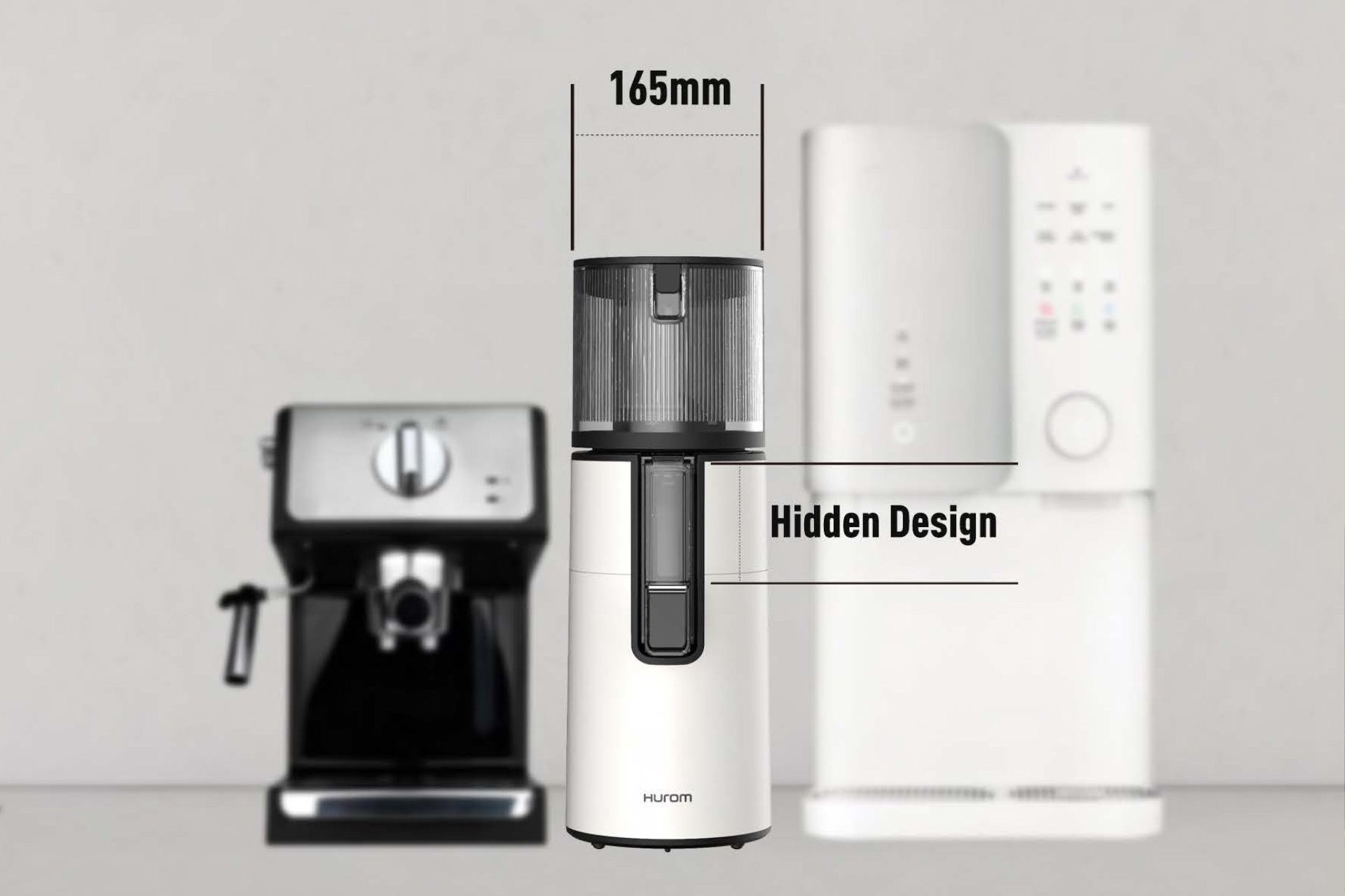 搾りかすカップがジューサー背面に内蔵されたスリムな縦型タイプで、