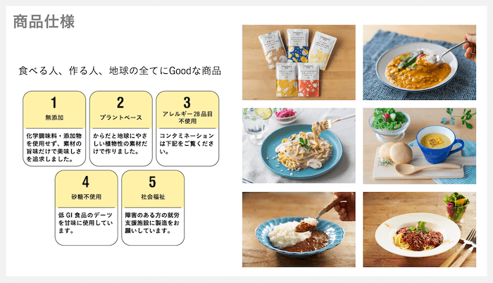 キーマカレーやボロネーゼソースなど、味と原材料に徹底的にこだわった5商品を展開。