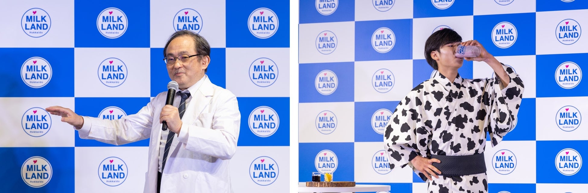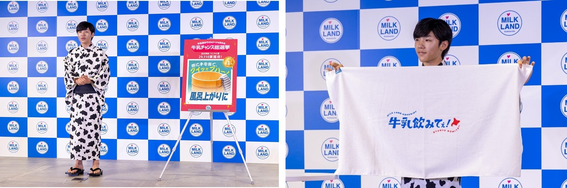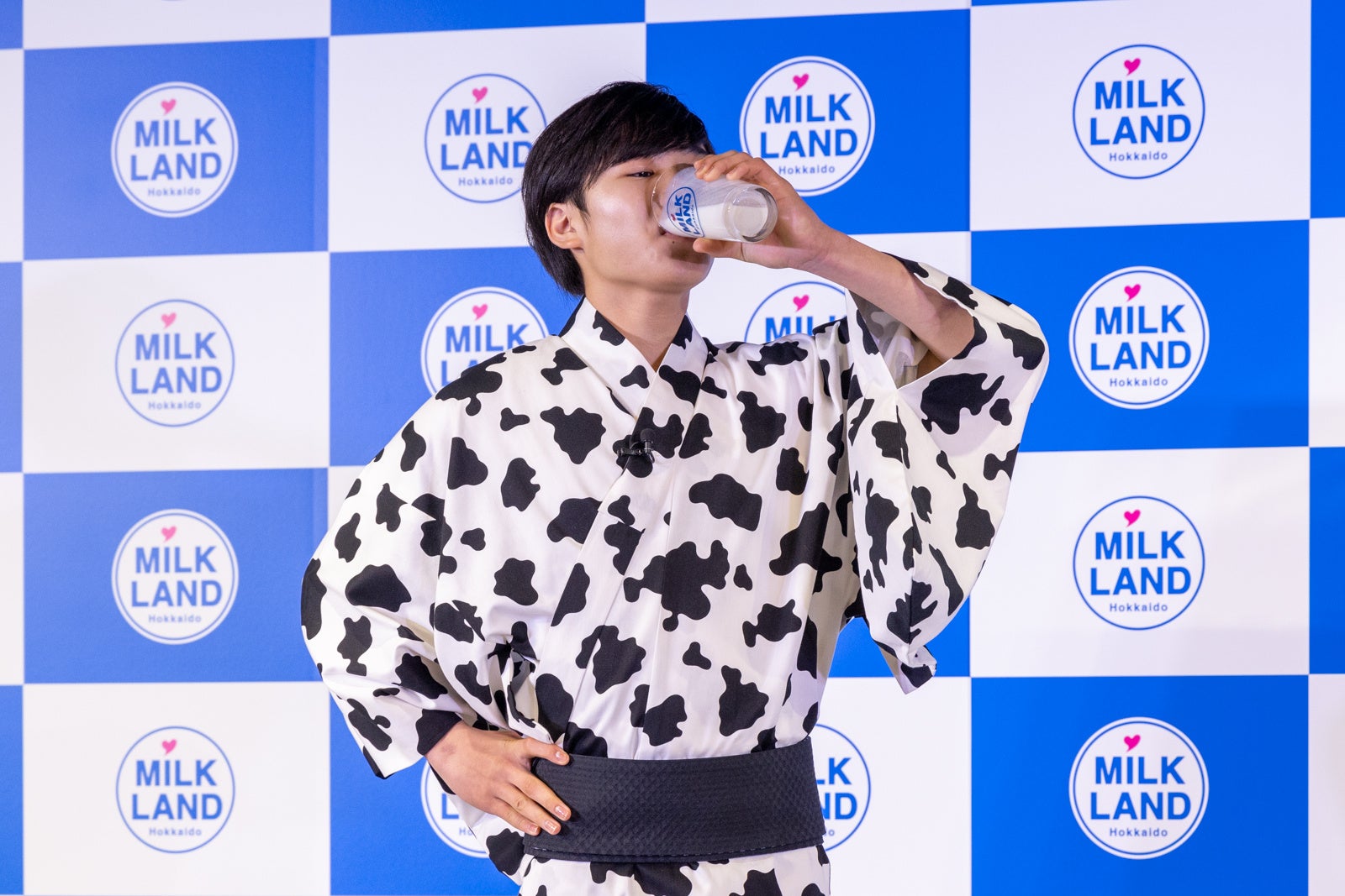 牛柄の浴衣姿について聞かれると「お風呂上がりには浴衣がピッタリなんじゃないかと思い、この特注の牛柄浴衣で参加させていただきました!」と嬉しそうに衣装を披露。さらに、新鮮な北海道牛乳を「ぷは~!やっぱりお風呂上がりの牛乳は最高ですね!いつも旅行に行った時、お風呂上りにはこうして浴衣姿で北海道の美味しい牛乳を飲んでいるんです。」と勢いよく飲み干しました。