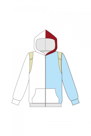 半冷半燃の個性をクレイジーデザインのカラーで表現し、フードは髪の毛のツートンカラーをイメージした左右で分かれたカラーリングにしました。