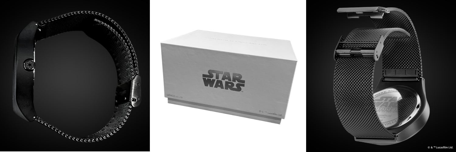 時計の背面には、『スター・ウォーズ エピソード 3 /シスの復讐』のロゴと、「THE DARK SIDE OF THE FORCE」という標語、そして死闘を繰り広げた「オビ=ワン・ケノービ」と「アナキン・スカイウォーカー」、リューズには帝国軍のアイコンが刻印されている。
