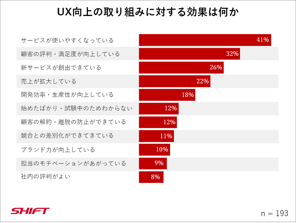UX向上の取り組みの効果として「サービスが使いやすくなっている」が41%と最も多い結果となりました。サービスが使いやすくなったことと関連して「顧客満足度」や「売上拡大」など、UX向上の効果が多岐にわたって表れています。