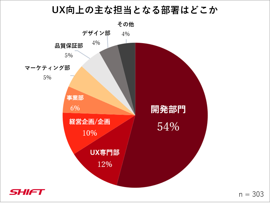 - 主な担当となる部署はどこか:54%は「開発部門」が主体となりUX向上に取り組む