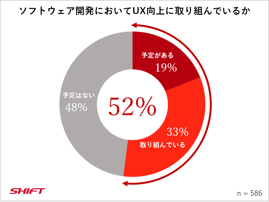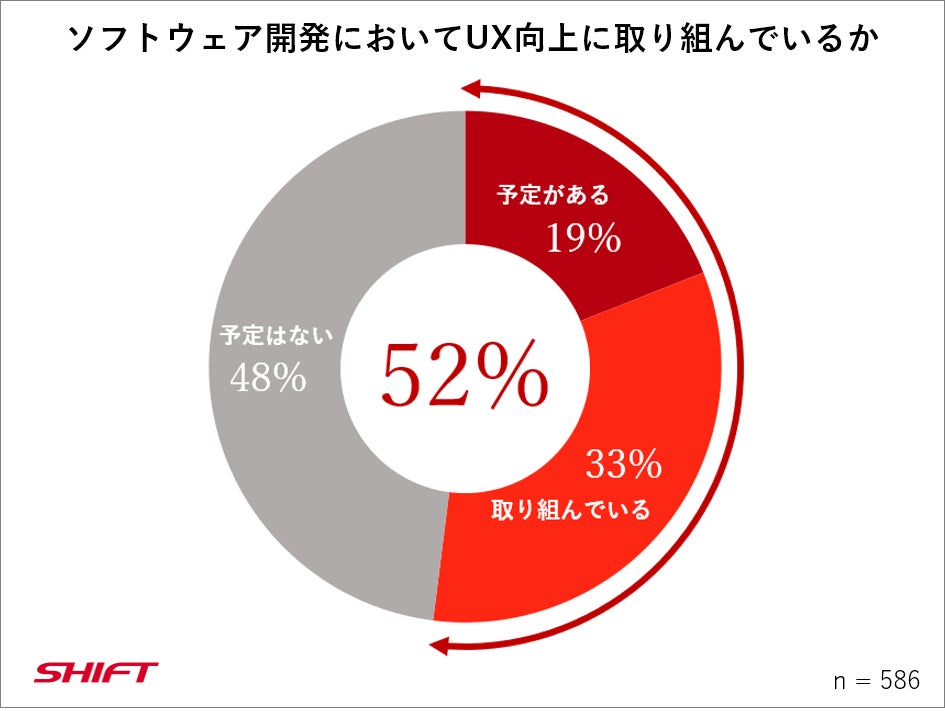 - ソフトウェア開発におけるUX向上の取り組みの状況:52%が開発においてUX向上に「取り組んでいる」「予定がある」と回答