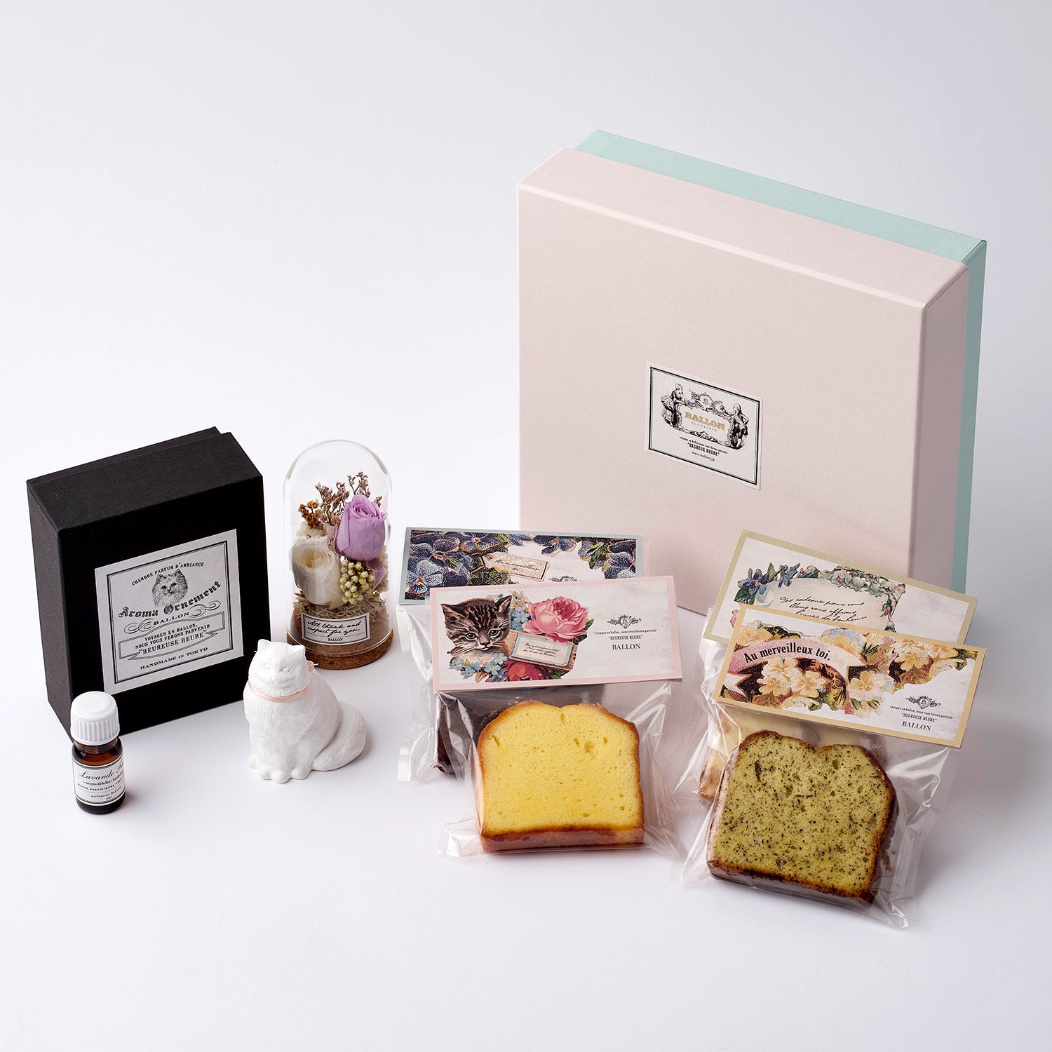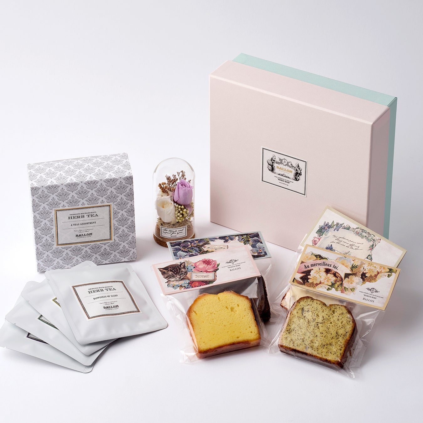 すみれ工房のパウンドケーキとBALLONハーブティー4種、ガラスドームアレンジメントのセット。