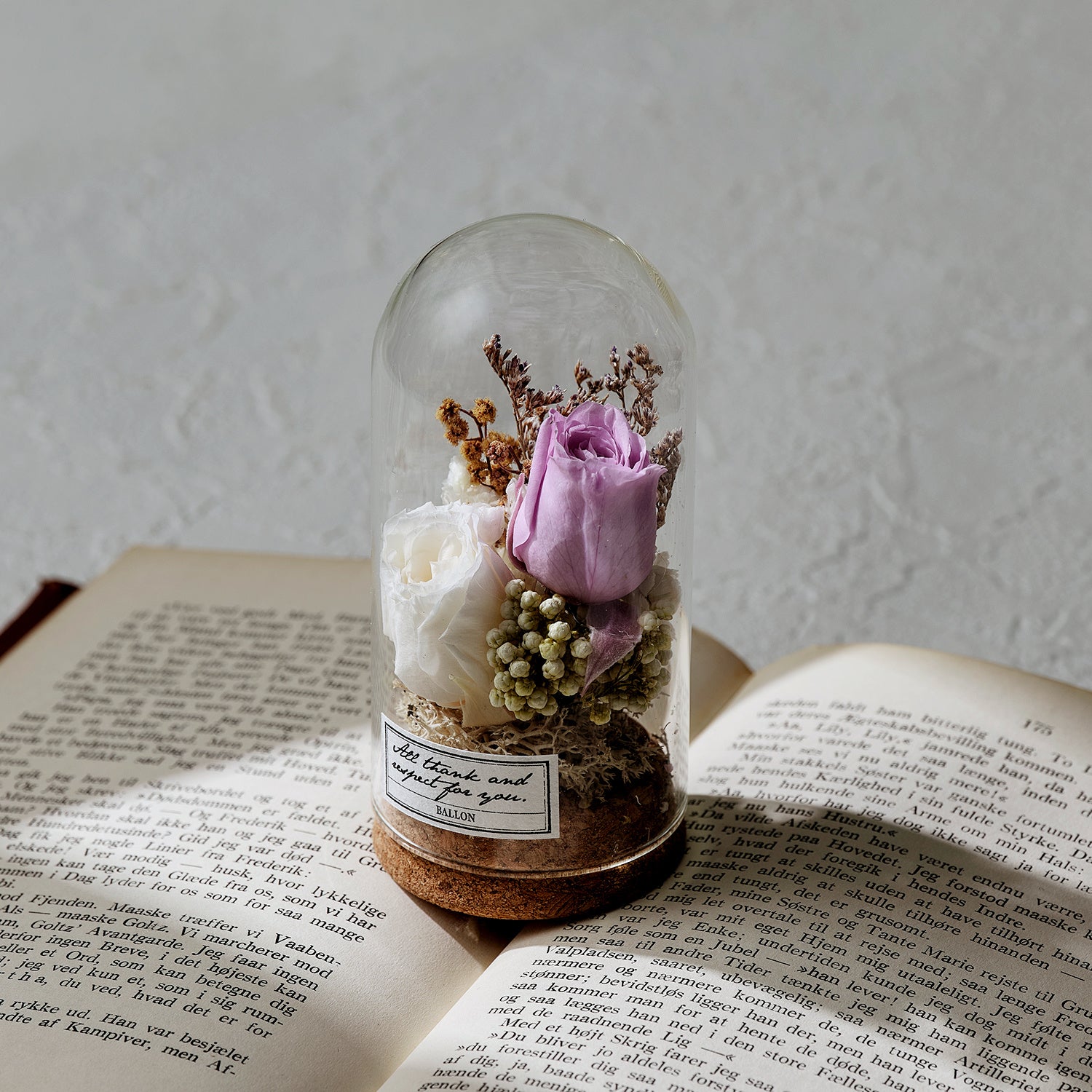 尊敬の花言葉をもつローズを中心に、大きすぎないサイズのガラスドームデザインでアンティークの植物標本のようなイメージでデザインしています。