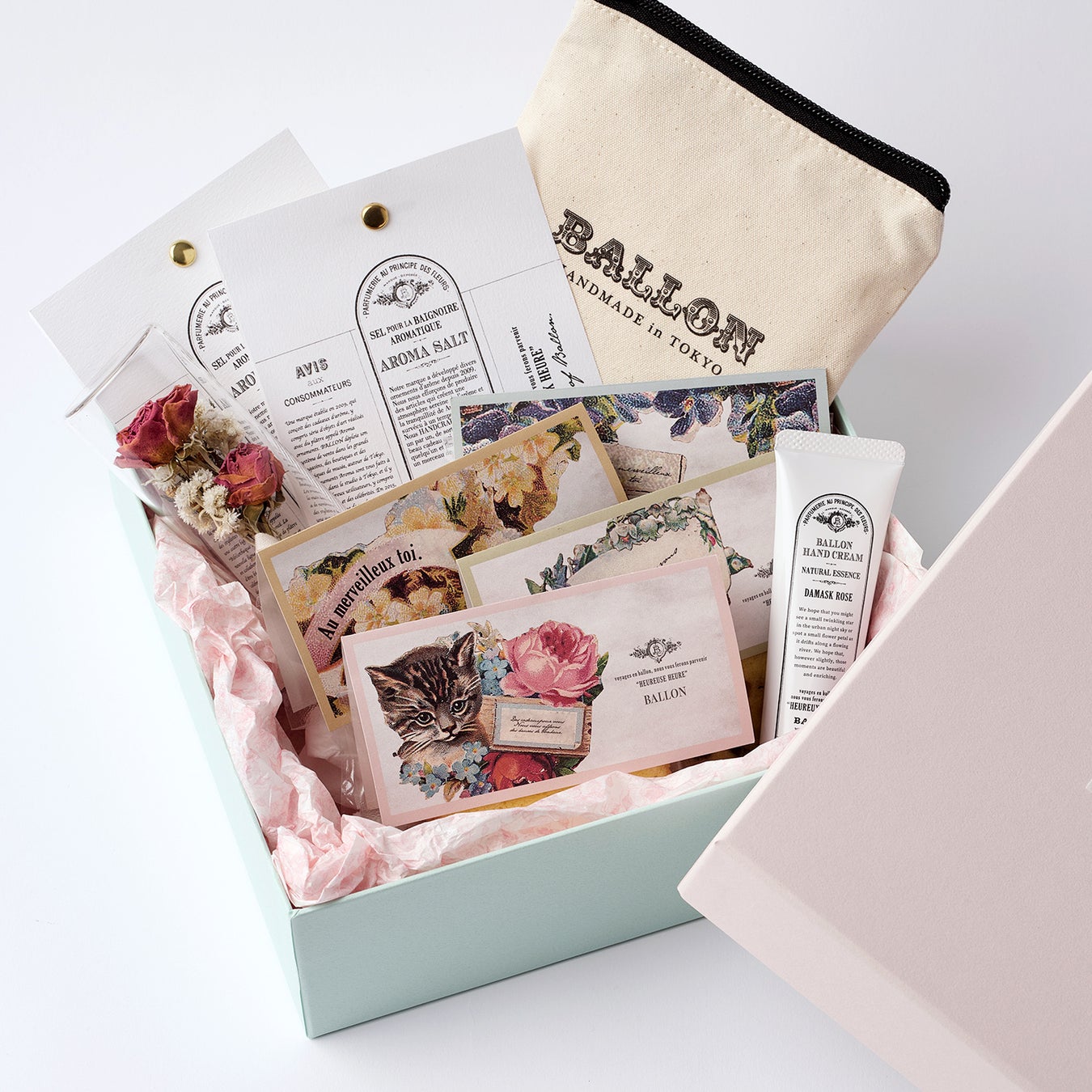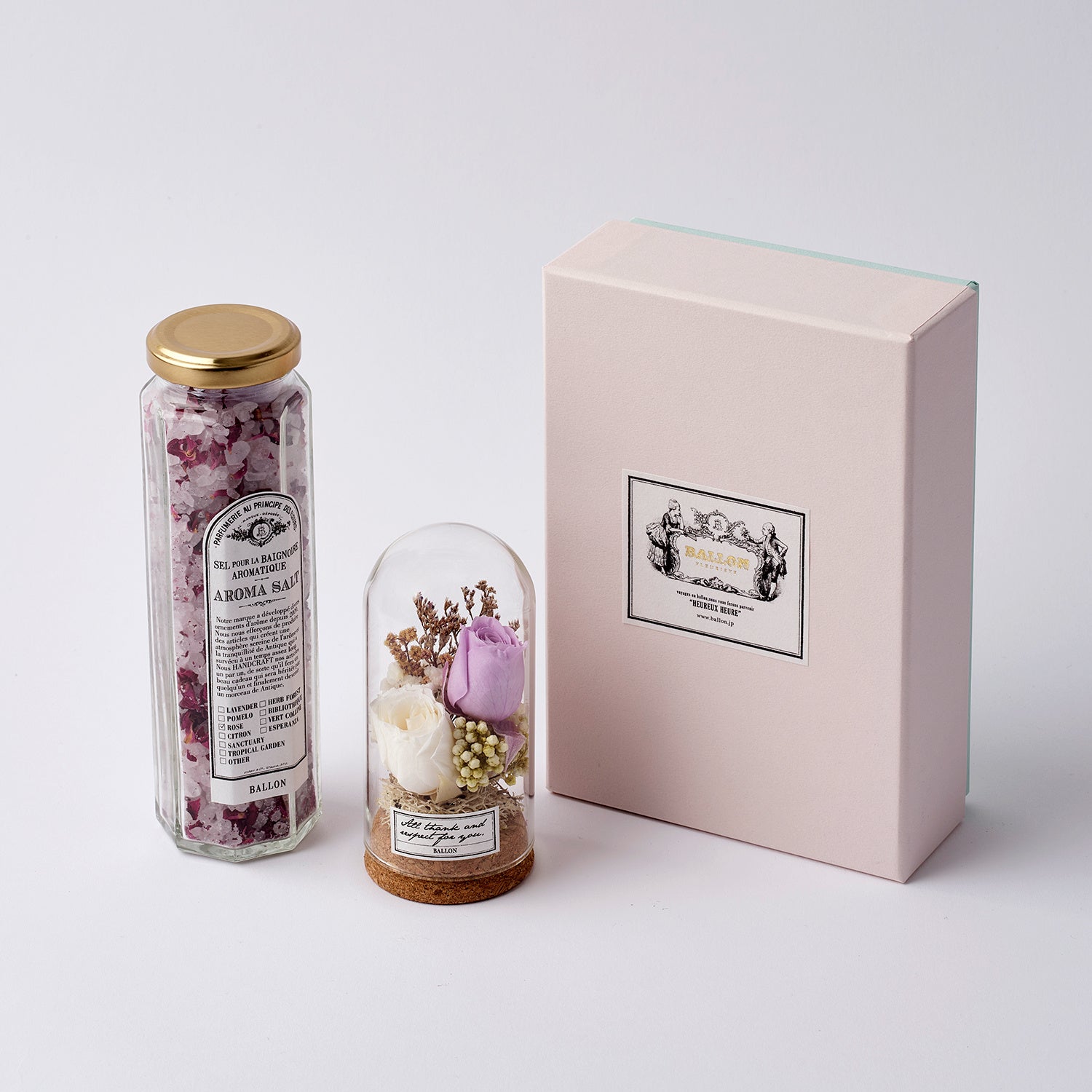 BALLONの定番的人気商品「アロマバスソルトギフトセット」の限定バージョンが登場。フラワーチューブはミニローズのアレンジメントに。ピンクとミントの優しいパステルカラーのギフトボックス仕様です。