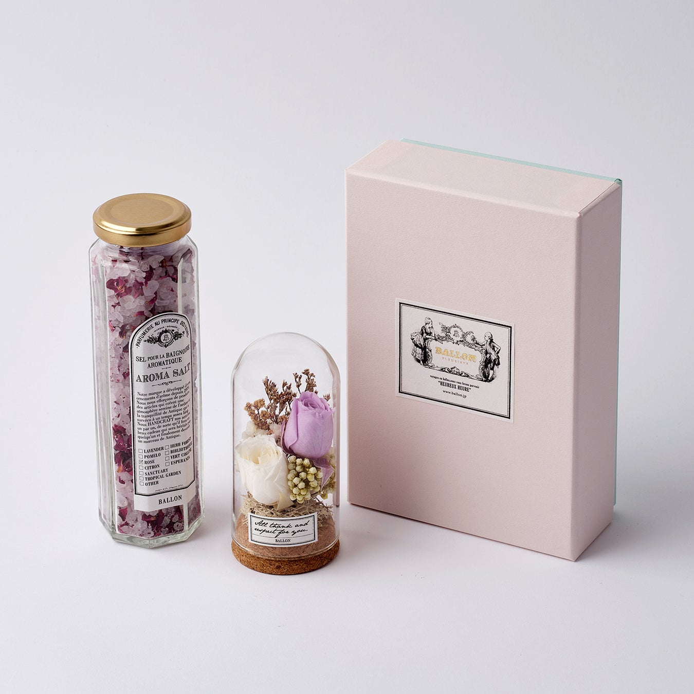 バスソルトのボトル1本とプリザーブドフラワーアレンジメントの限定BOXギフトセットです。