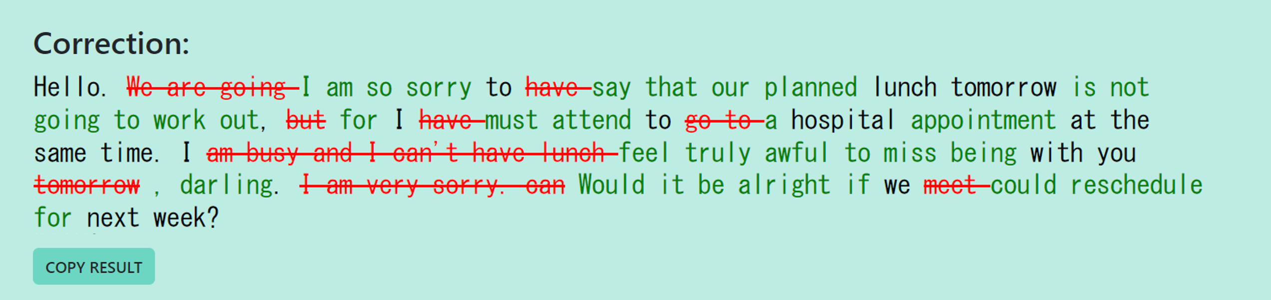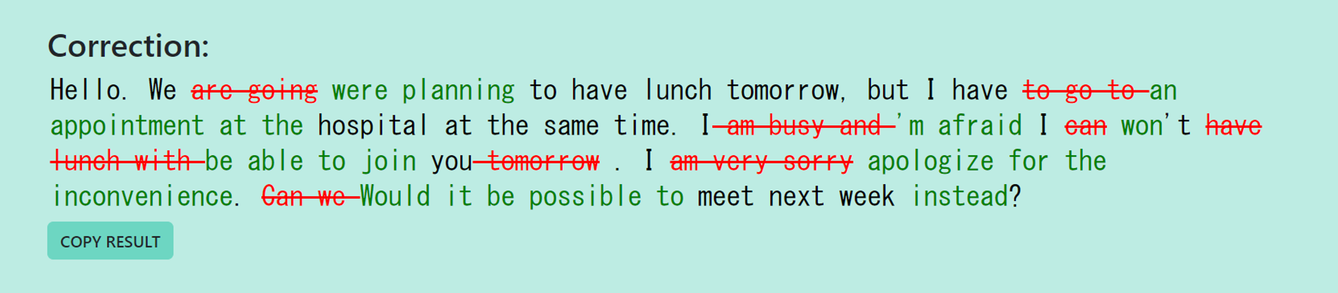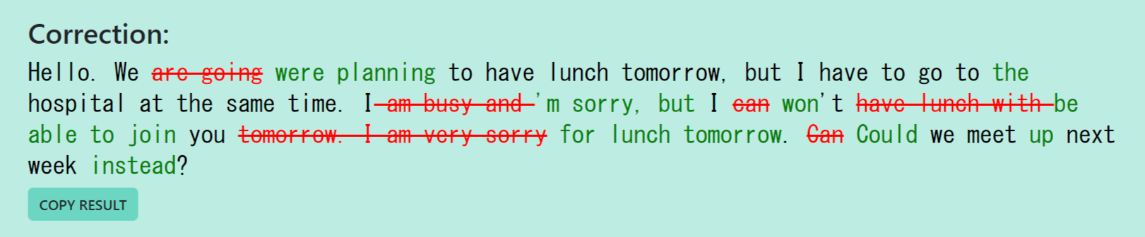 Hello. We are going to have lunch tomorrow, but I have to go to hospital at the same time. I am busy and I can’t have lunch with you tomorrow. I am very sorry. Can we meet next week?
