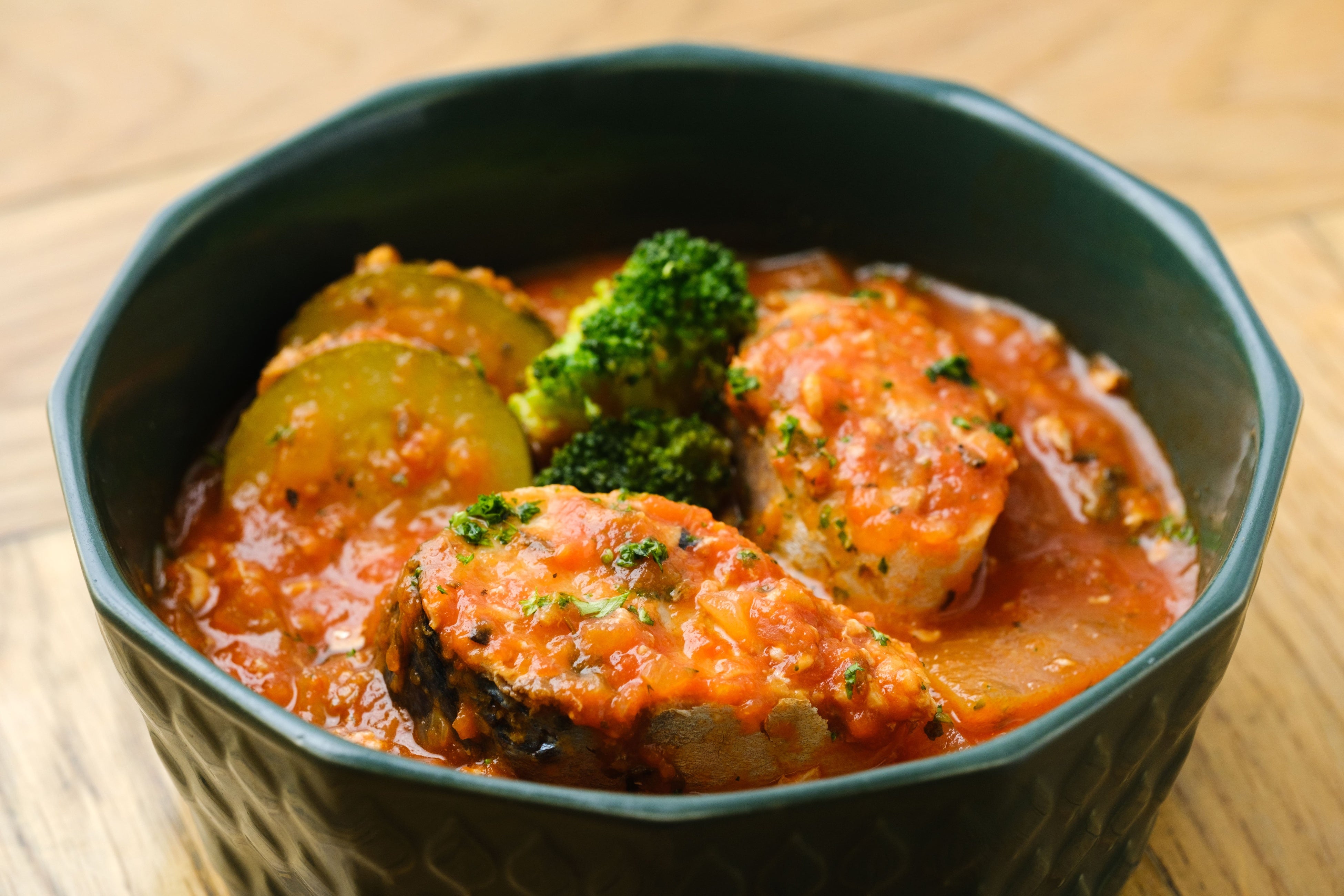 和のイメージの鯖が、濃厚トマトベースによく合います。イタリアンなズッキーニやブロッコリーも入って、バランスの良い一品。