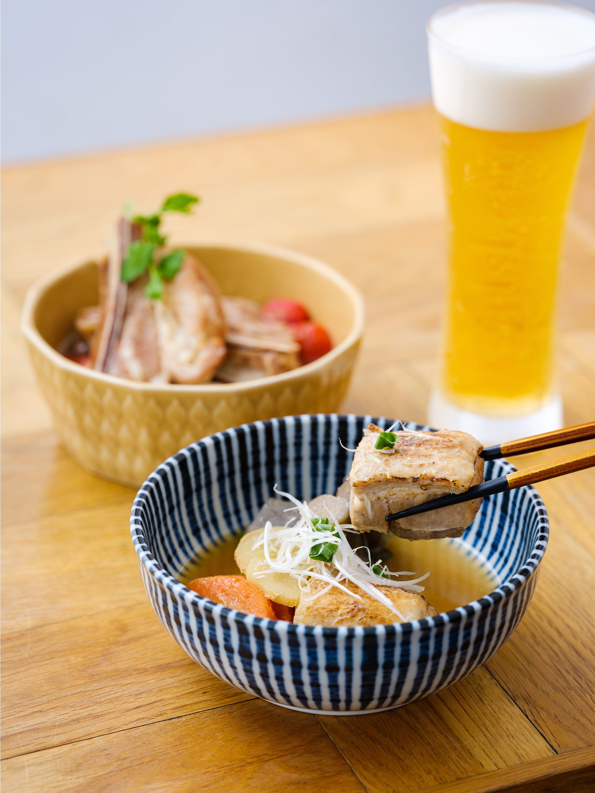 厚切りの三元豚を使用した食欲そそる炙り角煮。牛蒡の食感や、大ぶりの人参で多幸感に満たされる一品。