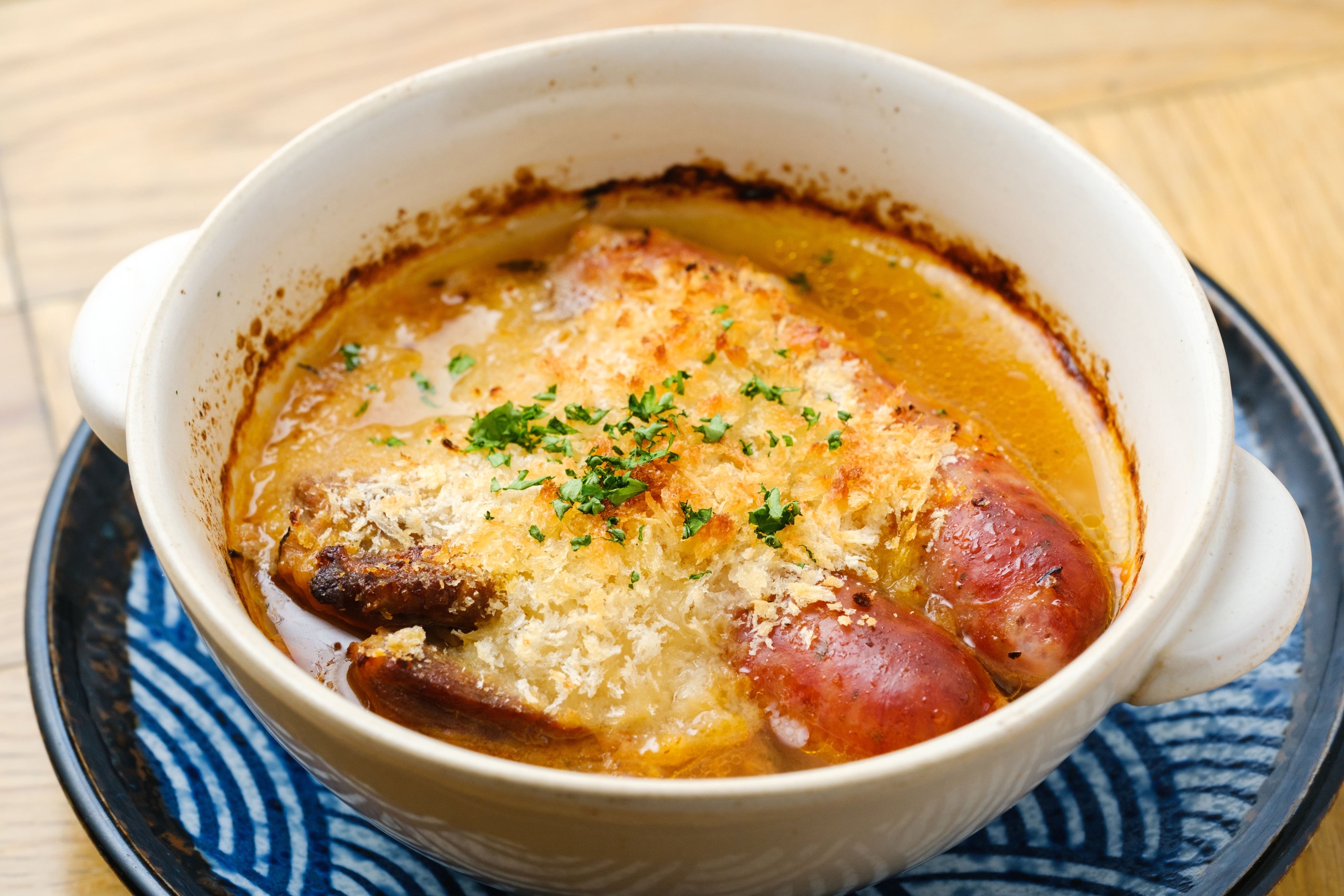 白インゲン豆とお肉を煮込んだフランスの家庭料理。大きな粗挽きソーセージと三元豚の豚肩ロースをじっくり煮込み、オーブンで香ばしく仕上げました。