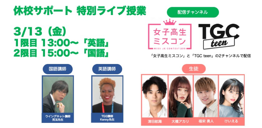 その⼀環として今回⾏うライブ授業配信を、10 代をターゲットとしたチャンネル「⼥⼦⾼⽣ミスコン」の公式チャンネルにて配信いたします。本ライブ授業配信では、視聴するだけでなく、コメントを送るなど、視聴者も参加しながら授業を受けることができます。ライブ授業の⽣徒役としては、モデルやタレントとして活躍し10 代から⼈気を集める⼥⼦⾼⽣ミスコン、男⼦⾼⽣ミスターコン出場者の現役⾼校⽣4 名が登場します。