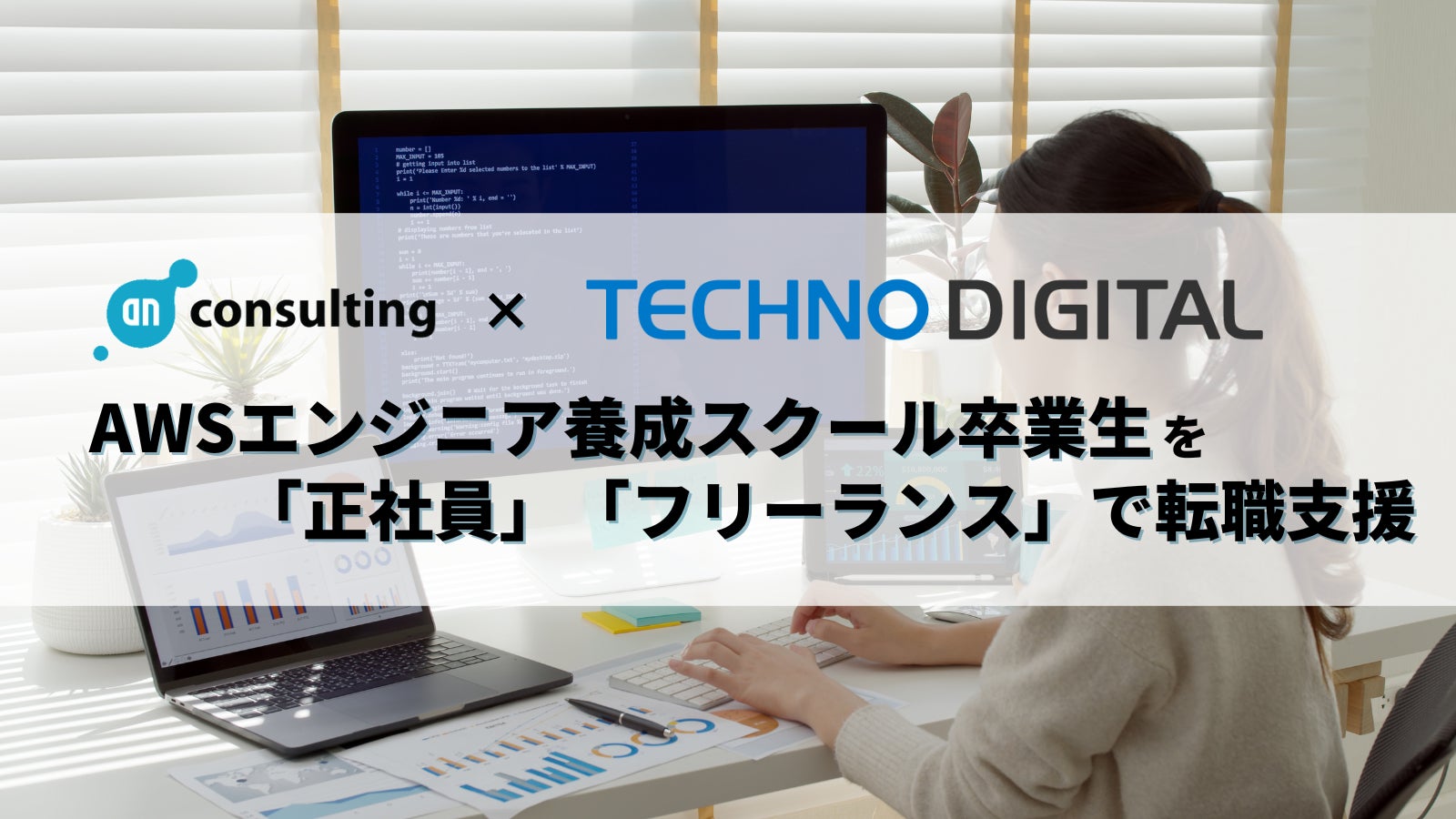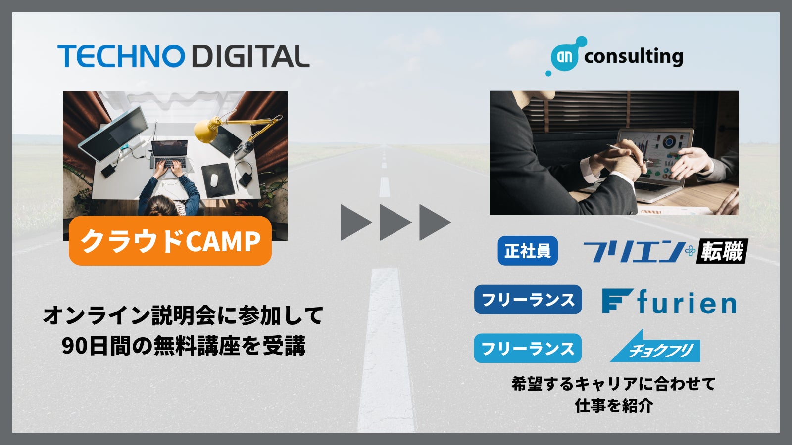 正社員の求人に特化した転職支援サービス「フリエン転職」、ITフリーランスのマッチングサービス「フリエン」「チョクフリ」を展開するアン・コンサルティング株式会社(本社:東京渋谷区、代表取締役:久利鋭一、以下「当社」という)は、株式会社テクノデジタルが運営するAWSプログラミングスクール「クラウドCAMP」と転職支援において業務提携を開始したことをお報せいたします。