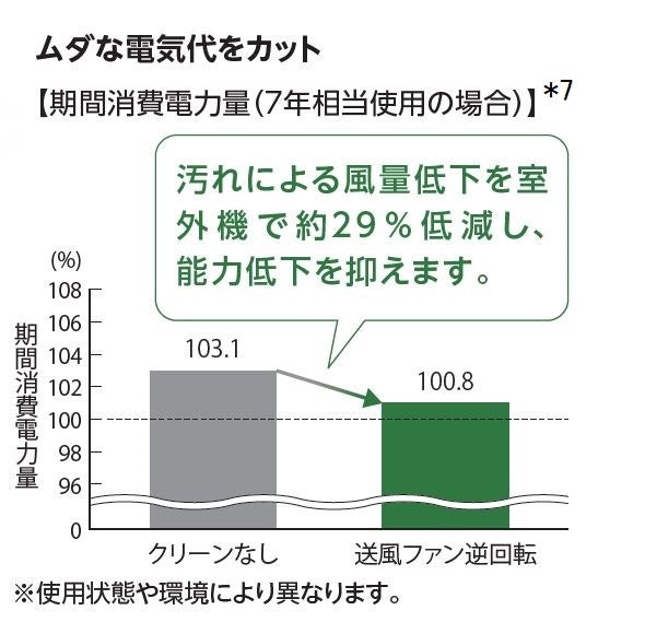 *7 日立ジョンソンコントロールズ空調株式会社調べ。ルームエアコン実証結果からの試算による一例(RAS-GP112RGH2の場合で試算)。JIS B 8616:2015に基づくAPFから算出された期間消費電力量は、新品を100とした場合の比率を記載。日立ジョンソンコントロールズ空調株式会社独自の条件に基づくものです。使用状態や環境により異なります。