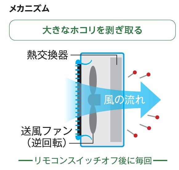 室外ユニット熱交換器の自動お掃除機能を採用しました。室外ユニットのファンを通常運転時の逆回転をさせることで熱交換器に付着したゴミやホコリを剥ぎ取ります。熱交換器の目詰まりを抑え*6、性能低下を抑制します。