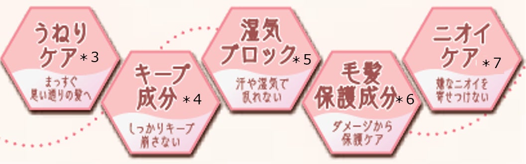 本製品はうねりケア成分*³で気になるうねり髪もまっすぐに整え、スタイルキープ成分*⁴や湿気ブロック成分*⁵で、汗や湿気から髪を守りながら、キレイなスタイリングを保ちます。