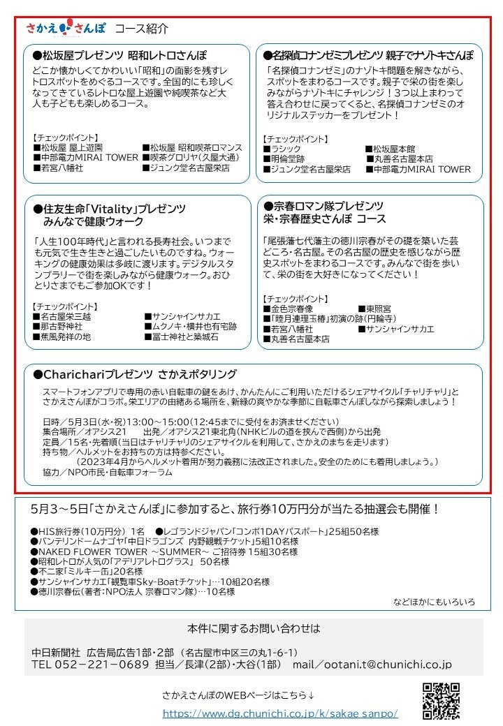 5月3~5日「さかえさんぽ」に参加すると、旅行券10万円分が当たる抽選会も開催!