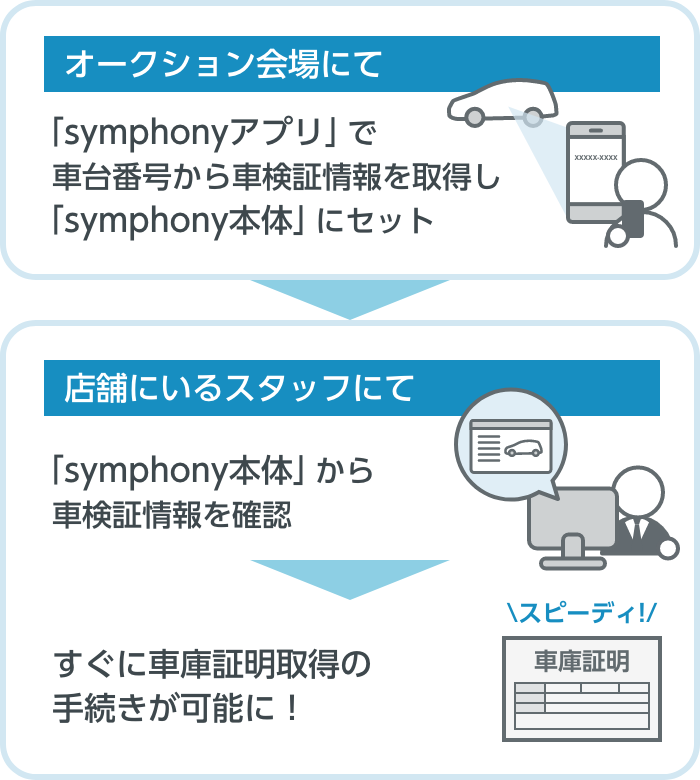 オークションで車を仕入れた業者は、車庫証明(クルマの保管場所の確保がされているかの証明)の手続きを行う必要があります。しかし、オークション時は車台番号のみしかわからないことから、車庫証明取得の申請に必要な「車両の大きさ」などの情報は、後日届く車検証を待つ必要があり、手続きにとても時間がかかっていました。