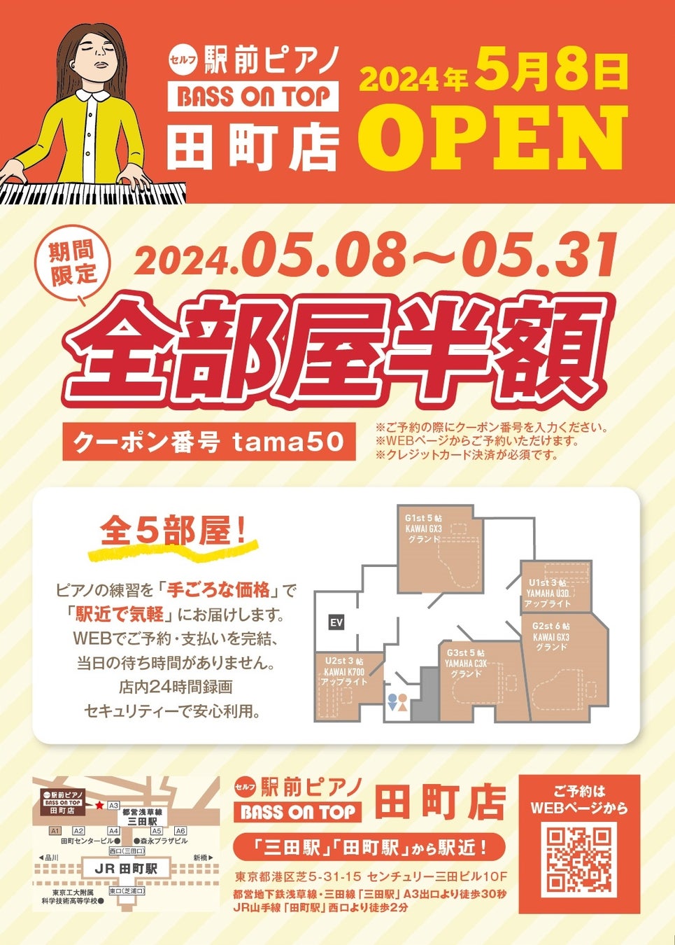 【期間限定!!全部屋半額キャンペーン】ピアノ練習するなら【駅前ピアノ ベースオントップ田町店】| 2024年5月8日オープン