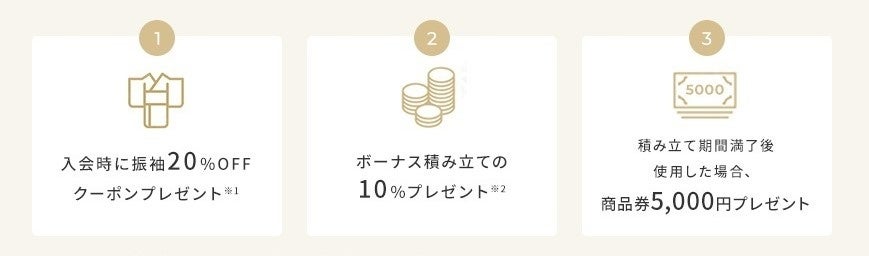 このような声を受けて今回新たに「友の会」に登場した『振袖積み立て』は、振袖の為に積み立てを行えるシステムです。最短1年間、月3,000円から積み立てができるため、先行きの見えないご時世でも計画的にお嬢様の振袖の準備を進められます。また、『振袖積み立て』として「友の会」にご入会いただいた方限定で振袖クーポンをプレゼントなどお得な特典※ も満載です。