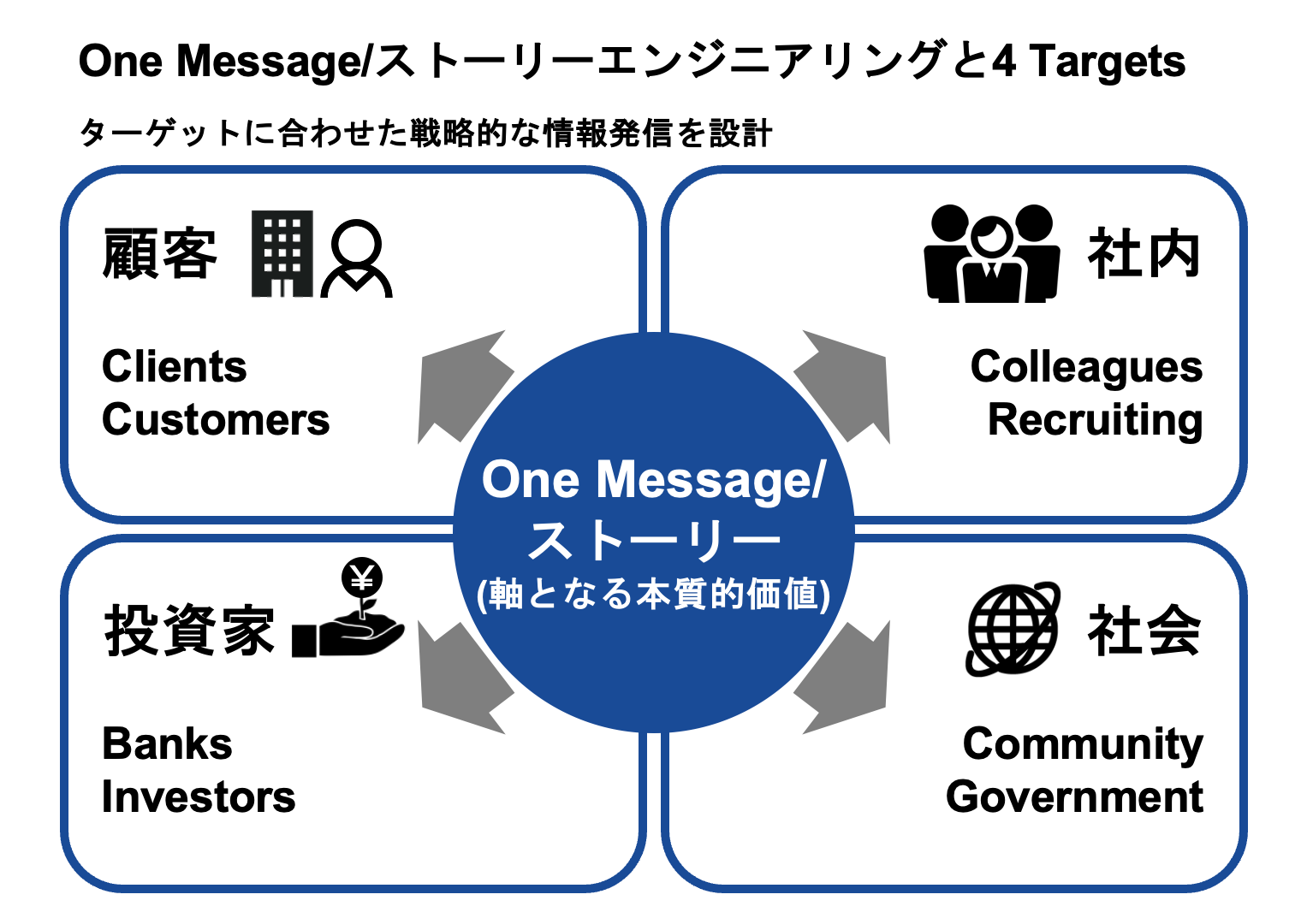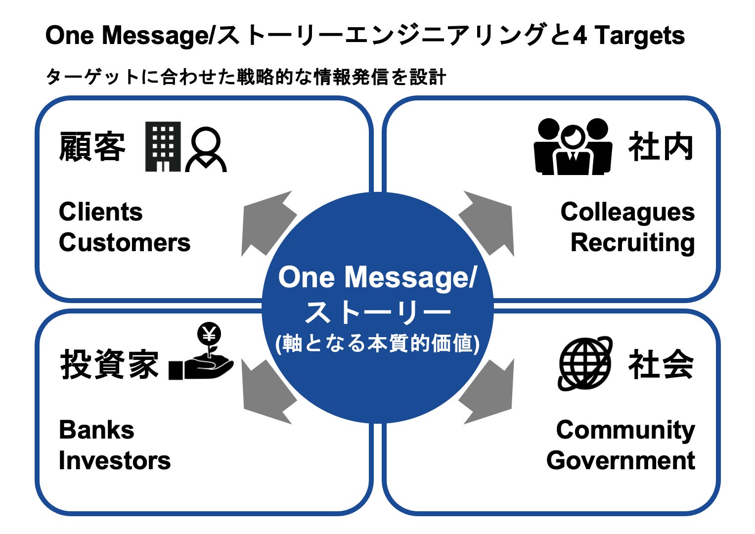 根本的な価値となる「One Message」はひとつですが、それをもとに、どのような情報発信をするかはターゲットに合わせて戦略的に変える必要があります。企業に影響力が大きい顧客・投資家・社内・社会の人々を「4 Targets」と設定し、ターゲット別にどのような認知を得るか、どのようなムーブメントを起こすべきかを設計・ご提案します。