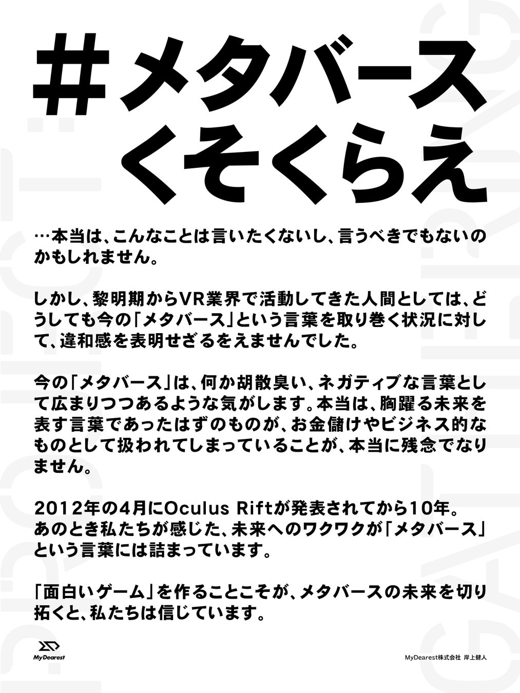今の「メタバース」は、何か胡散臭い、ネガティブな言葉として広まりつつあるような気がします。本当は、胸躍る未来を表す言葉であったはずのものが、お金儲けやビジネス的なものとして扱われてしまっていることが、本当に残念でなりません。