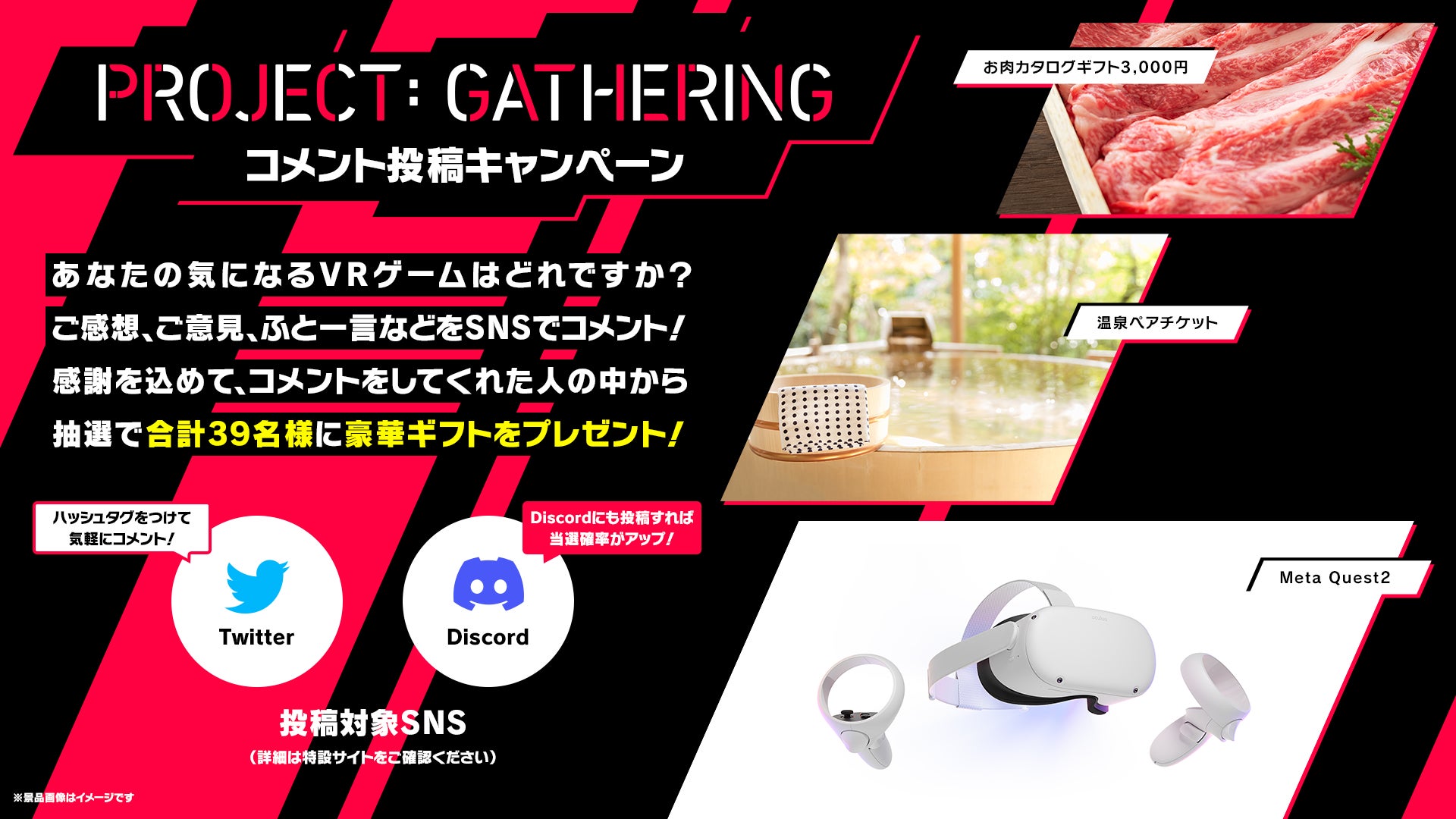 TwitterもしくはDiscordでコメント投稿をしてくださった方の中から、抽選で最大39名様に豪華景品をプレゼントいたします。TwitterとDiscordそれぞれで投稿数をカウントし、500件突破でお肉カタログギフト、1,000件突破で温泉ペアチケット、1,500件突破でMeta Quest 2が景品に追加されます。