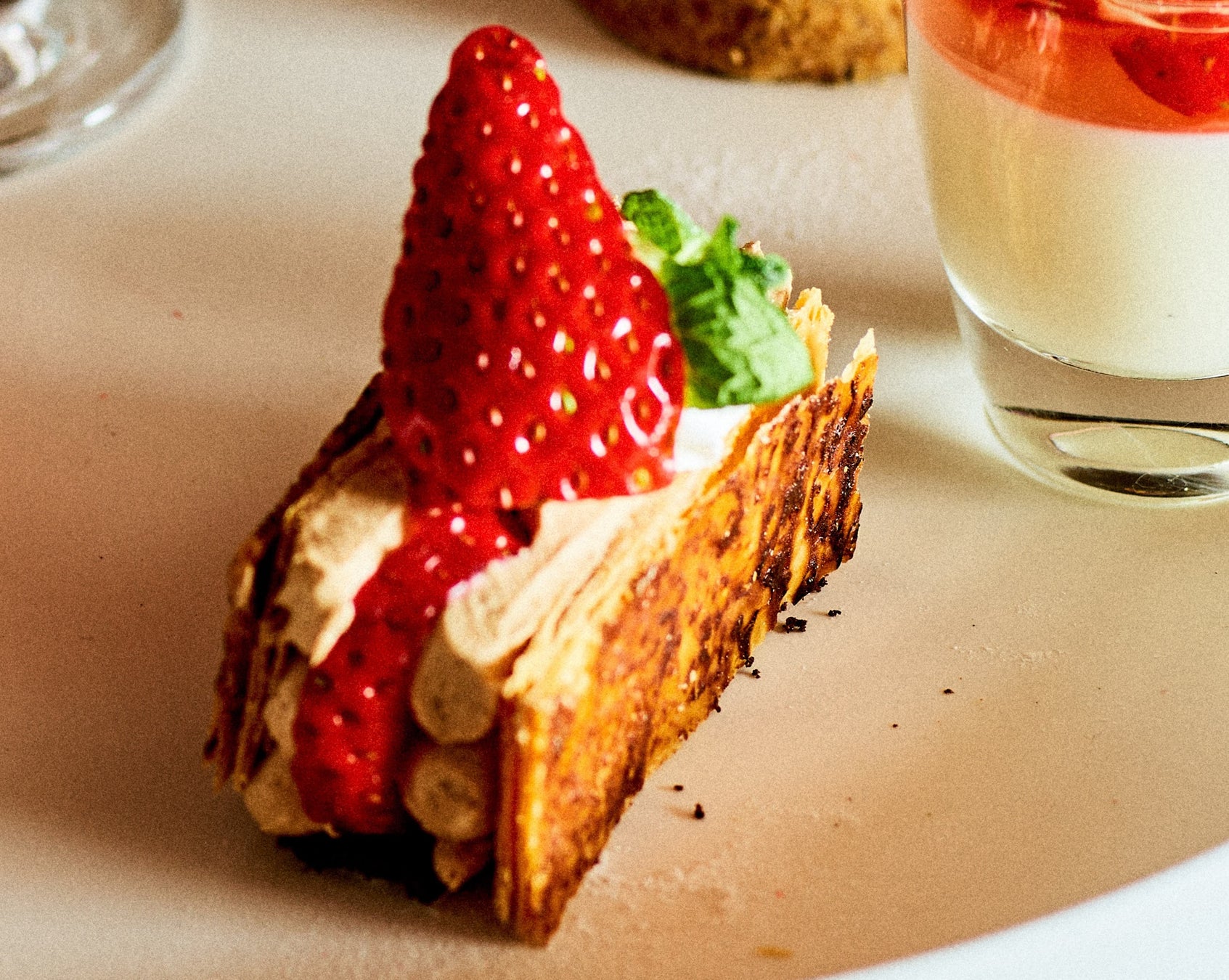 フレッシュないちご、プラリネのカスタードクリームをパイ生地でサンドしたミルフィーユ。そのまま手で取ってお召し上がりください。